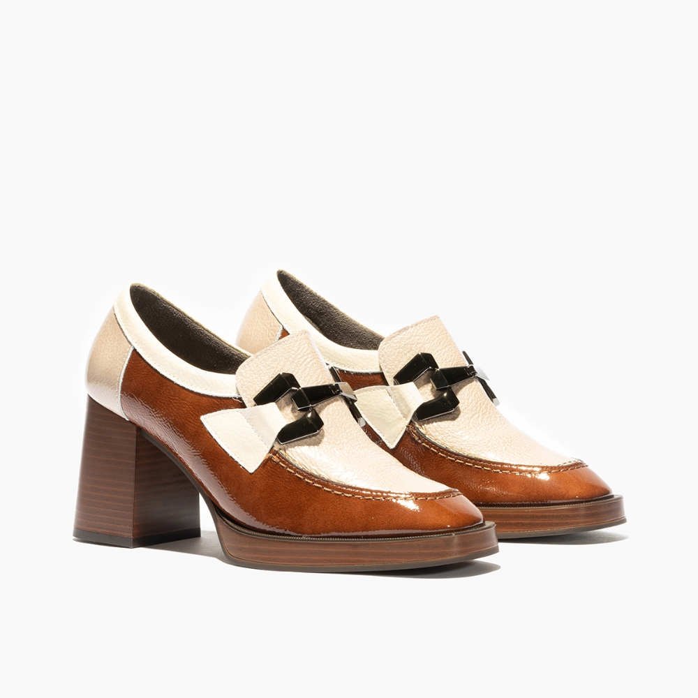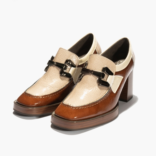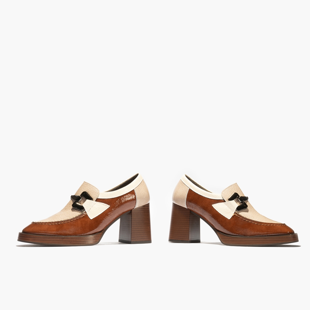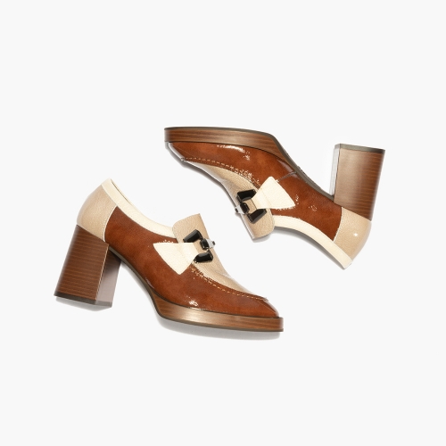 Mocasín con tacón alto de la marca Pitillos para mujer. Fabricado en piel de gran calidad con detalle en el empeine. Color marron