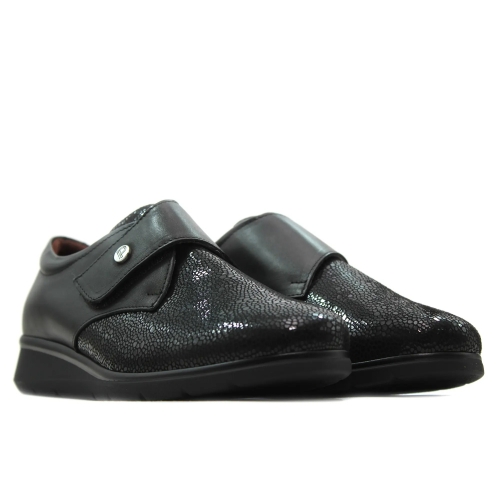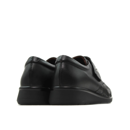 Zapato para mujer, mocasín de estilo deportivo, tipo sneakers, con cuña baja de 4 cm de altura. Estilo casual,para diario, fabricado en piel y tela. Cierre de tira con adesivo. Pitillos 10710 color Negro. Hecho en España. Modelo sencillo y clásico ideal para fondo de armario. Sencillo, clásico.