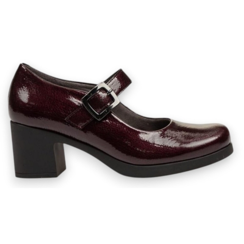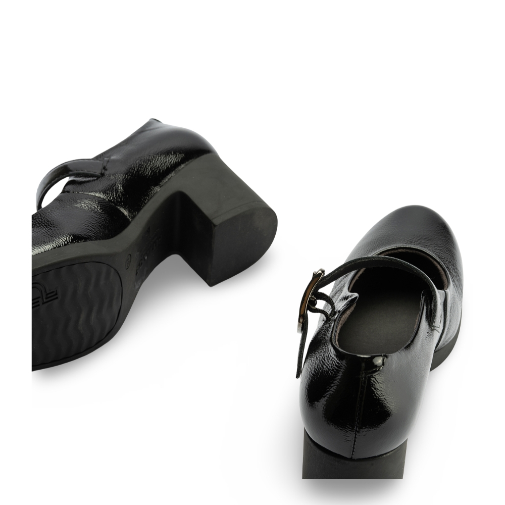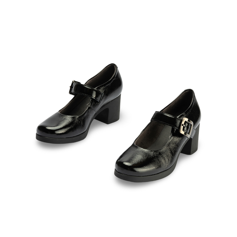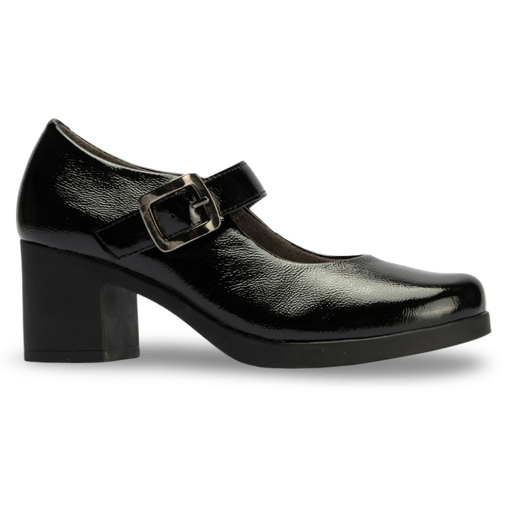 Zapato de tacón Pitillos 30100. Acabado en charol negro con una tira ancha y hebilla que aporta un toque retro muy sofisticado. Ideal para eventos o el día a día si buscas un zapato cómodo con personalidad.