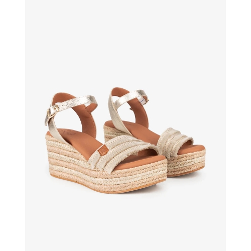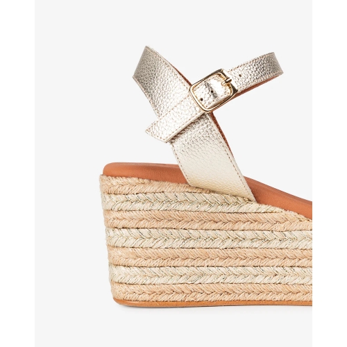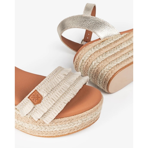 Esta cuña baja, con punta redonda es un básico para combinar con cada look de verano, de piel y detalles en la pala de flecos. Súper cómoda por su cierre con hebilla al tobillo y su planta acolchada. Estas sandalias de piel y yute son imprescindibles en tu colección de calzado de verano.