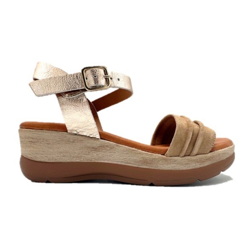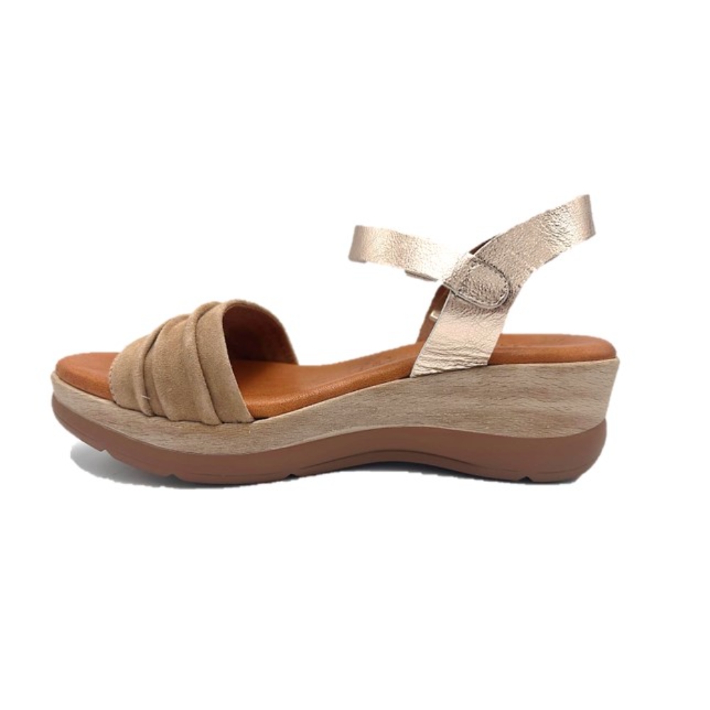 Sandalia tipo confort con cuña baja de la marca Rivera para mujer. Fabricada en España con piel de gran calidad. Color camel