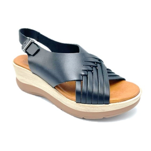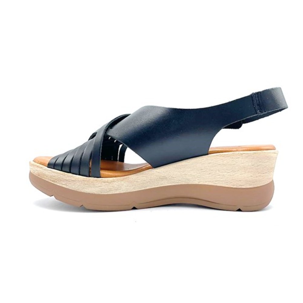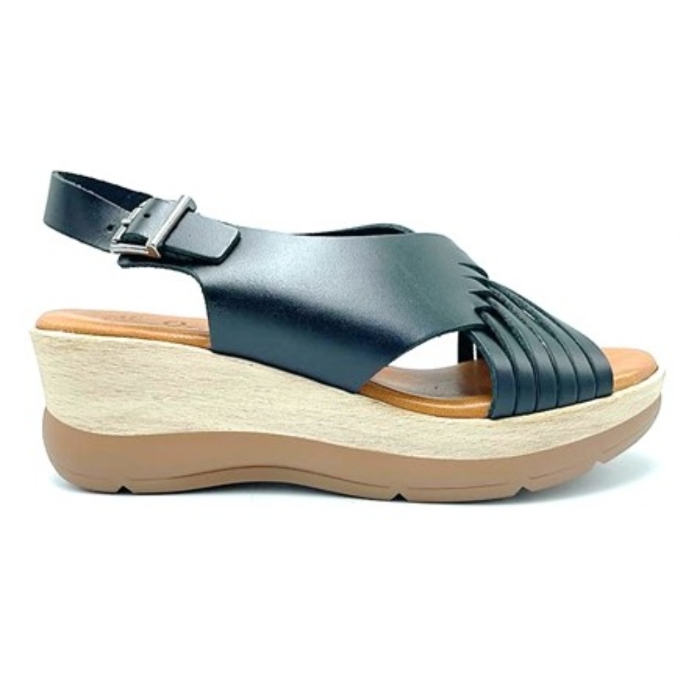 Sandalia con cuña baja y plataforma de la marca Rivera para mujer. Fabricada en piel de gran calidad con plantilla de gel. Color negro