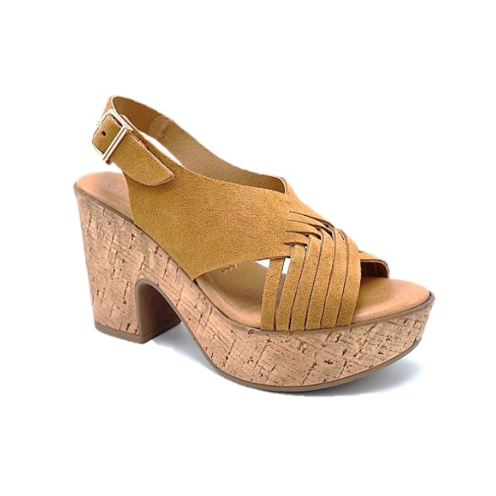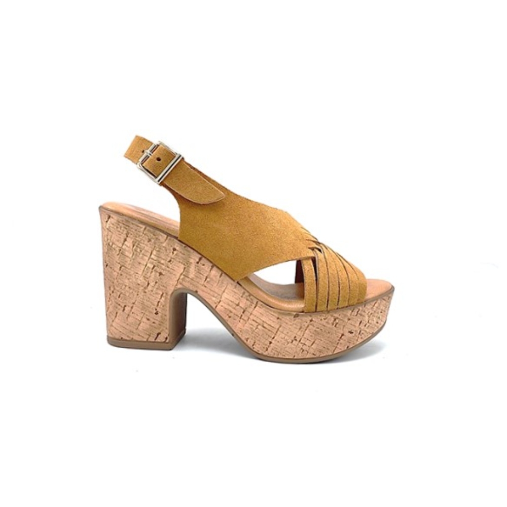 Sandalia con tacón y plataforma de la marca Rivera para mujer. Fabricada en piel de gran calidad con plantilla de gel. Color whisky