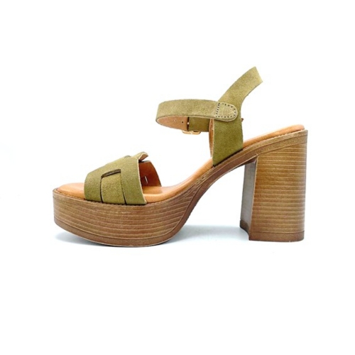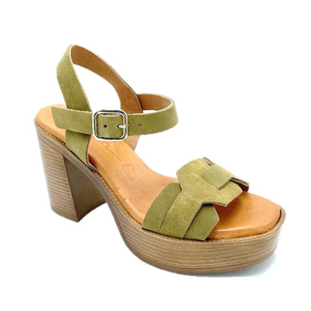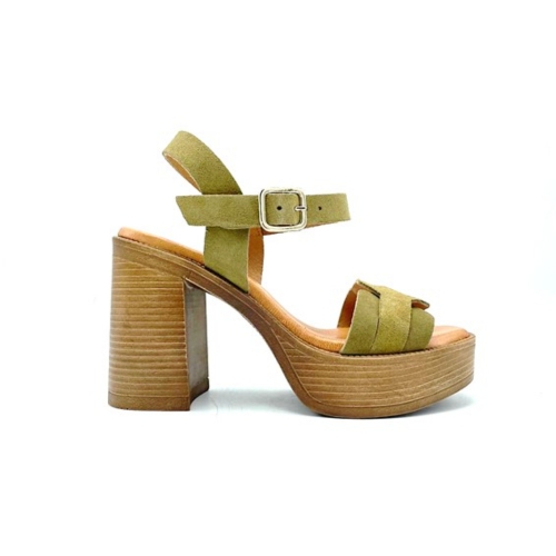 Sandalia con tacón y plataforma de la marca RIvera para mujer. Fabricada en España con piel de gran calidad y plantilla de gel para mayor comodidad. Color militar