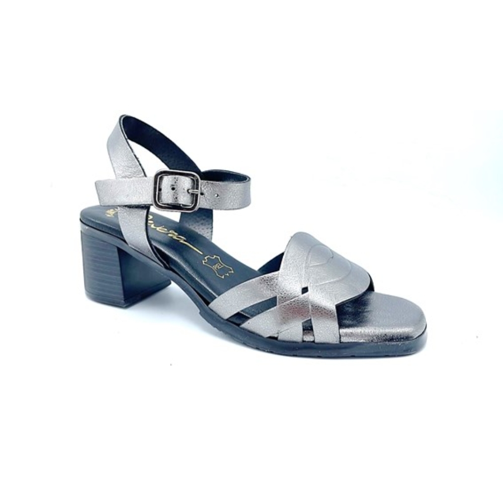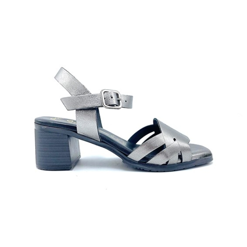 Sandalia con tacón bajo, fabricada en piel de gran calidad con plantilla de gel extra cómoda. Color estaño metalizado