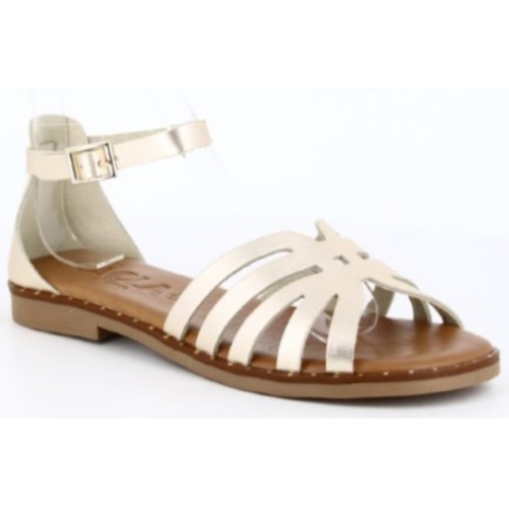 Sandalia plana con talón cerrado para mujer. Fabricada en España con piel de gran calidad con plantilla de gel acolchada que aporta una gran comodidad. Color platino