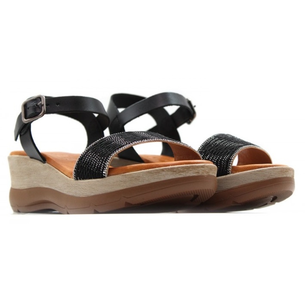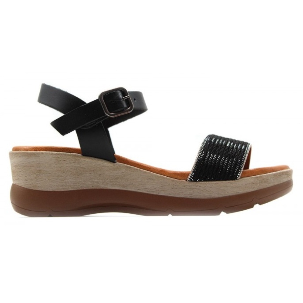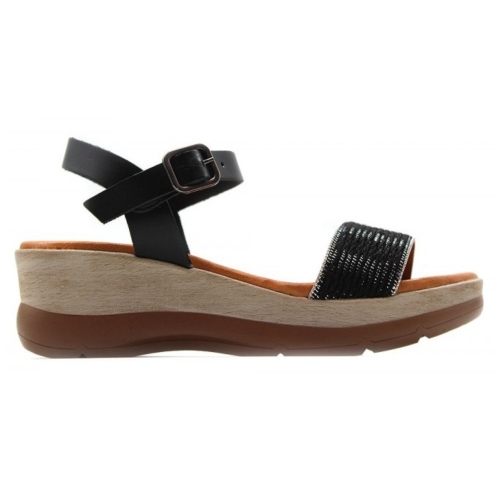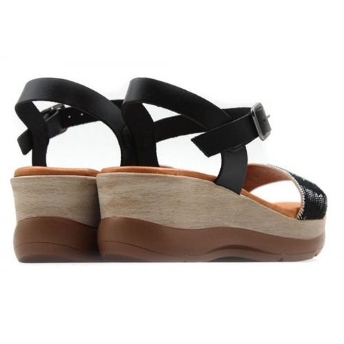 Sandalia con cuña baja y plataforma de la marca Rivera para mujer. Fabricada en España con piel de gran calidad y plantilla de gel. Color negro
