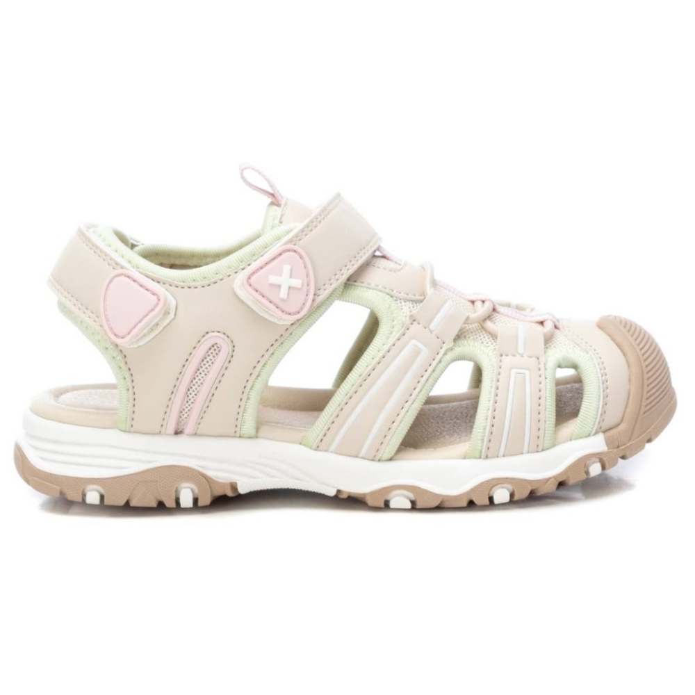 Sandalia niña, tipo trekking. Marca Xti kids. Fabricado en material que imita a la piel con el interior textil para más comodidad. Cierre mediante tiras adherentes que se ajustan al tobillo. Cómoda planta y resistente suela de goma antideslizante. Este modelo ha obtenido el certificado vegano por la organización mundial PETA (Organización de los derechos de los animales).