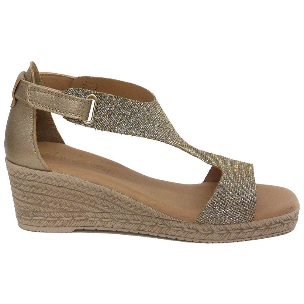 Sandalia con cuña baja de la marca Andares para mujer. Fabricada en piel de gran calidad en tono brillantes, plantilla de gel acolchada y cierre de velcro al tobillo para una mayor sujección. Color cava