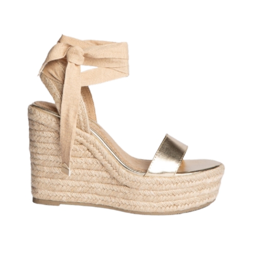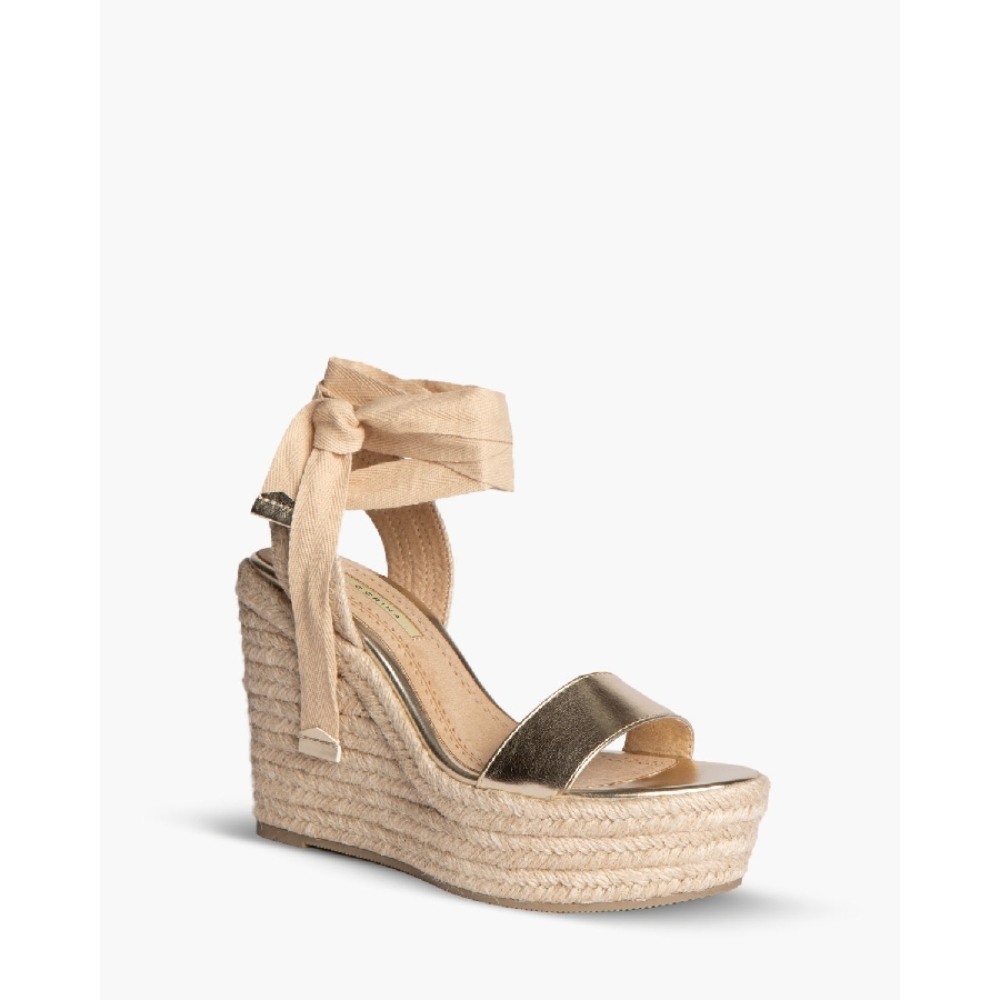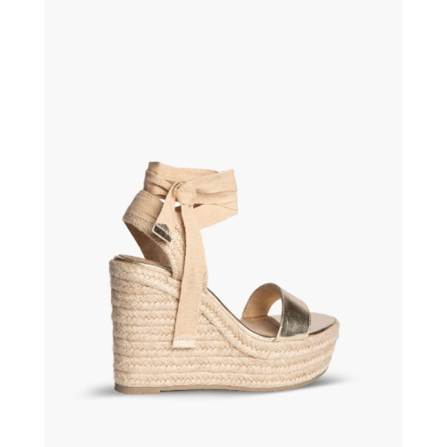 Sandalia de plataforma, con cuña de yute. Corte de pala y cierre mediante tiras atadas al tobillo.