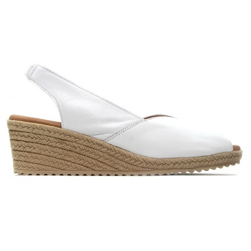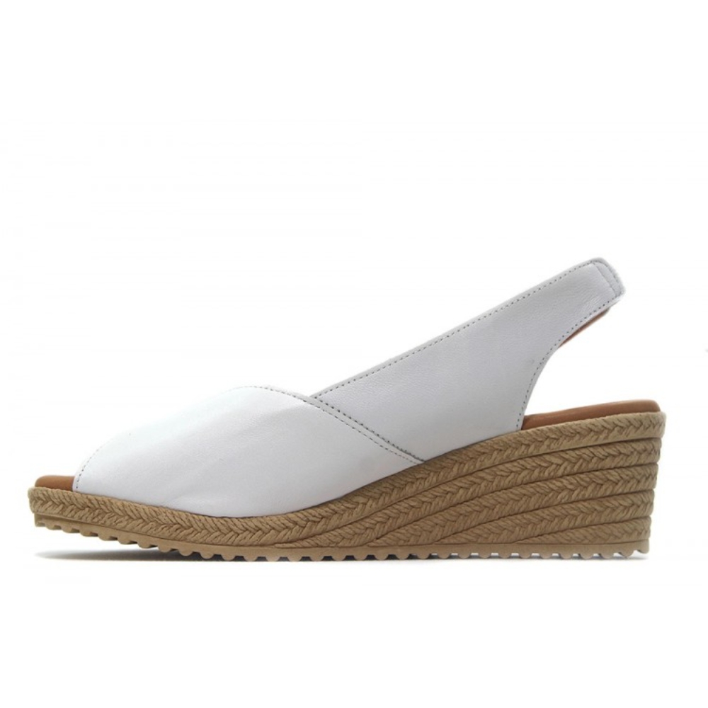 Sandalia con cuña de 6.5cm de altura, plataforma de 3cm, Kaola 193 color platino, dorado, oro, zapato destalonado con los dedos fuera, estilo juvenil casual, planta de gel, fabricada en piel, hecho en España. Muy cómodas ideal para diario. Suela imitación a esparto de goma. Color liso, clásica, fondo de armario. Tira con elástico al tobillo.