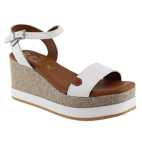 Sandalia con cuña alta y plataforma. Plantilla de gel de la marca Rivera para mujer. Fabricada en España con piel de gran calidad. Color blanco
