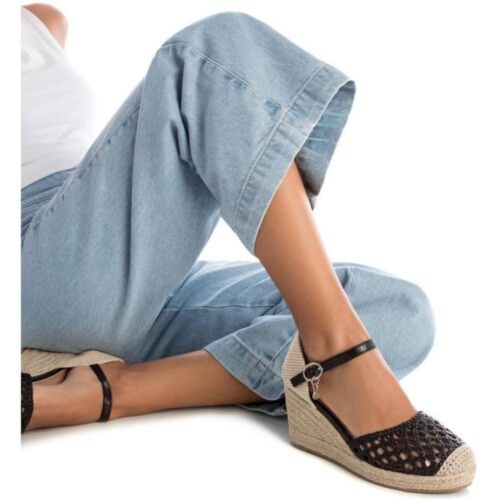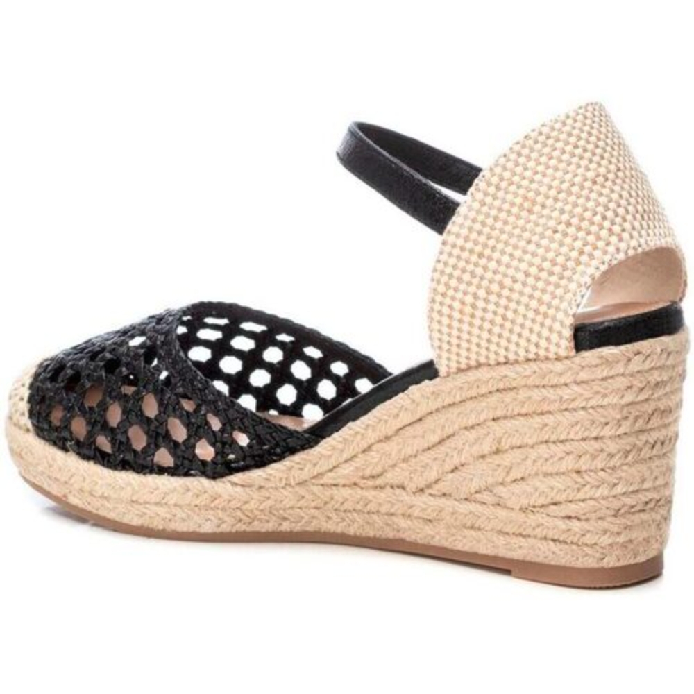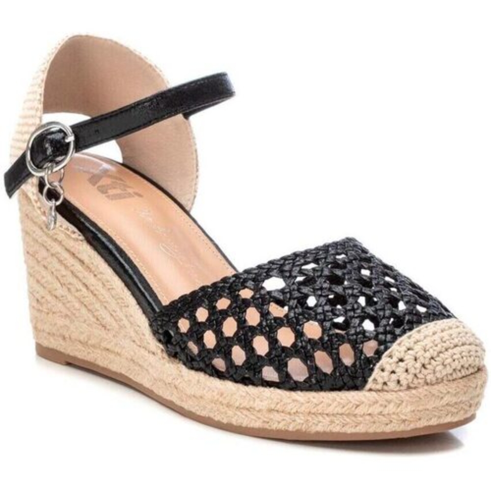 Sandalia con cuña alta de la marca Xti para mujer. Fabricada en material sintético con cuña y plataforma de esparto. Color negro