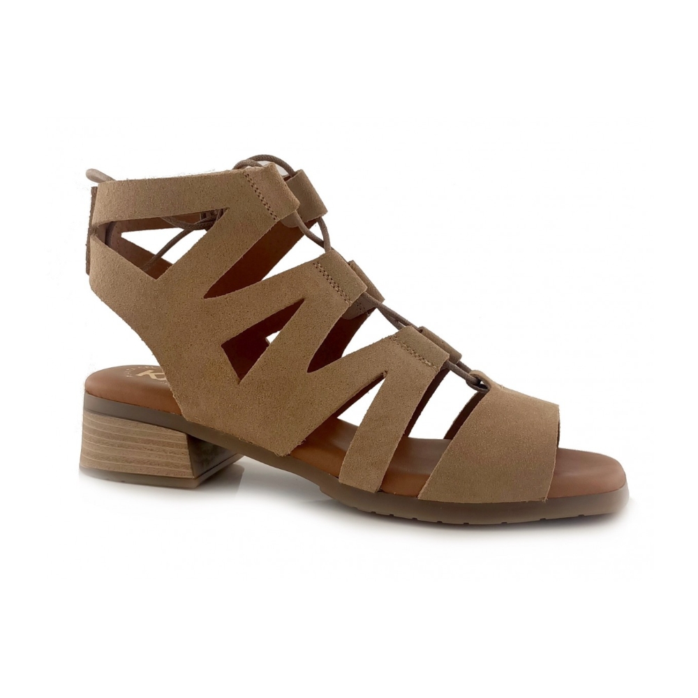 Sandalia tipo romana de Rivera en serraje color camello con tacón bajo y cierre de cordones.