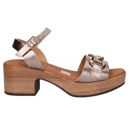 Sandalia con tacón bajo y plataforma de gel de la marca Rivera para mujer. Fabricada en España con piel de gran calidad y cierre con hebilla para una mayor sujección. Color cava