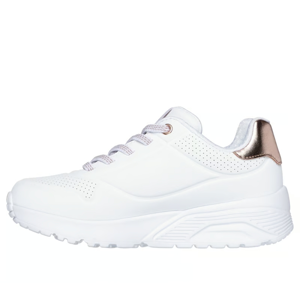 Sube el nivel de tus zapatillas con la comodidad y la amortiguación de Skechers Street™ Uno Lite. Este modelo moderno con cordones elásticos presenta una parte superior de sintética de durabuck con ribete metalizado, cierre Adaptive Closure de Skechers, plantilla Skechers Air-Cooled Memory Foam® y media suela con amortiguación con cuña de plataforma.