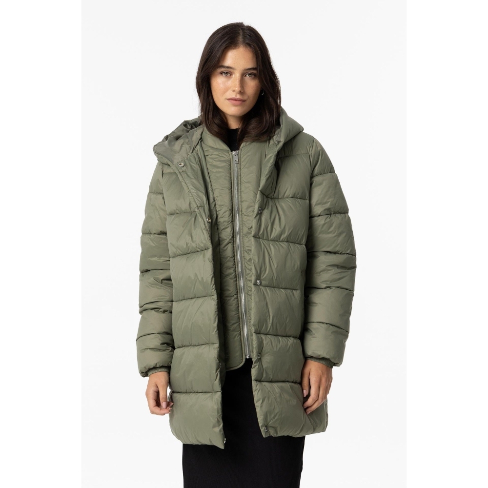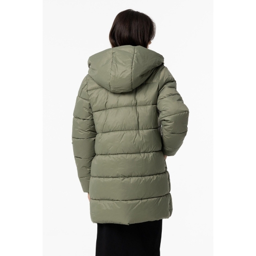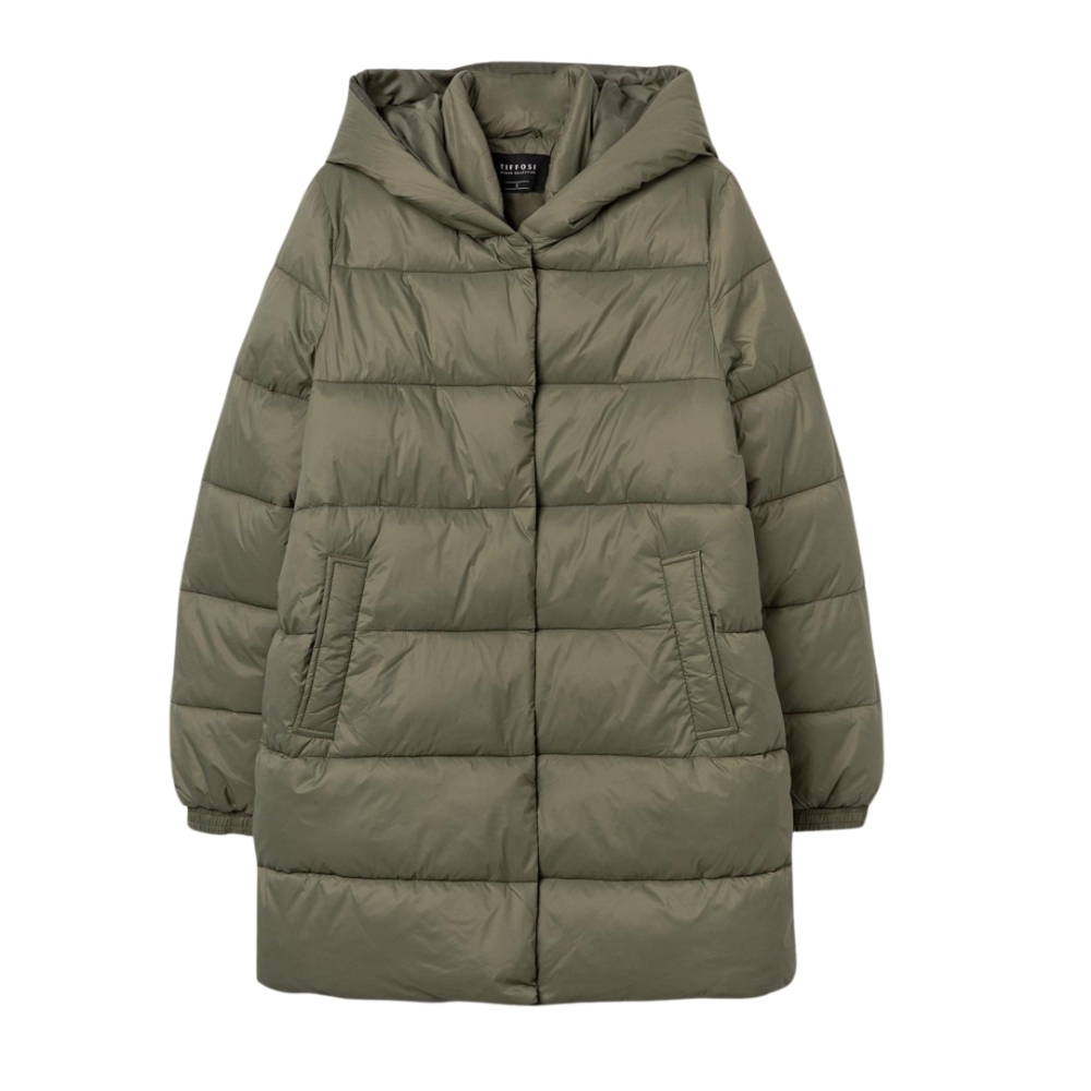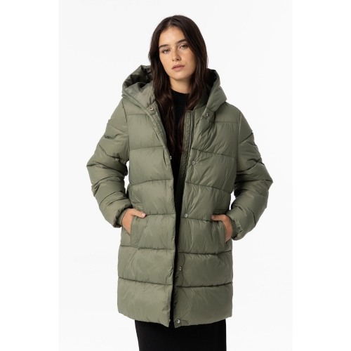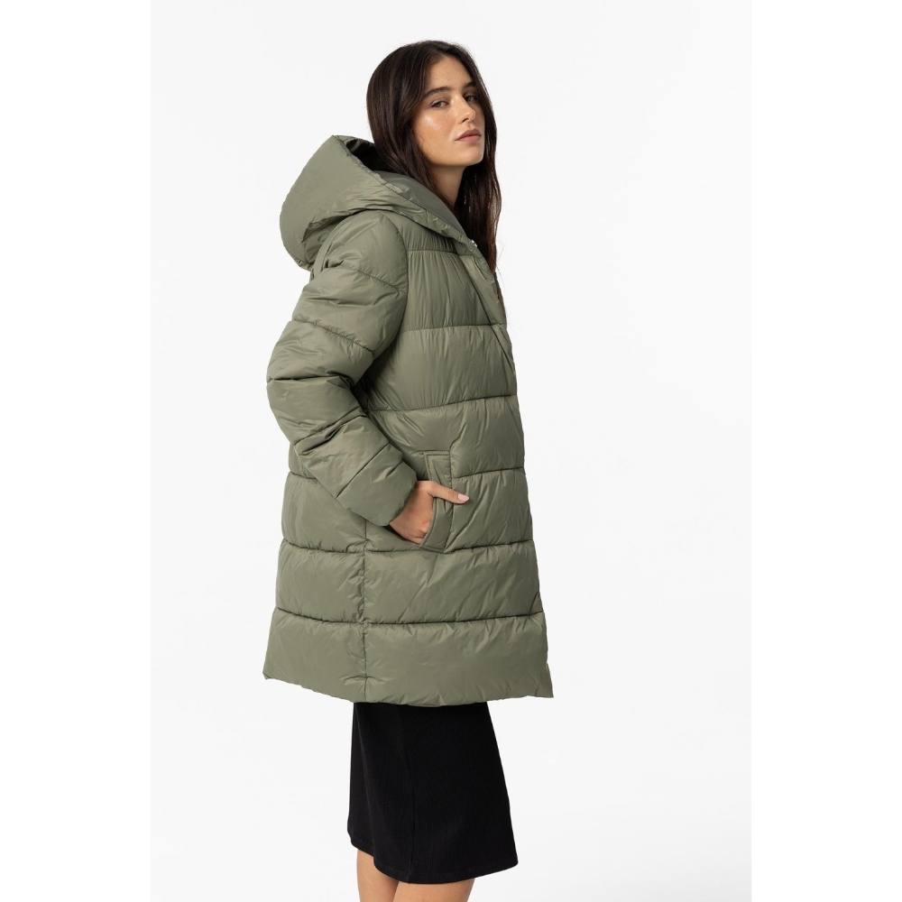 Cazadora cortavientos larga y acolchada con cremallera interior y tapeta con botones de presión. Capucha, dos bolsillos delanteros y manga larga.