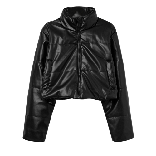Chaqueta cropped de cuello subido y manga larga. Bolsillos laterales y cierre frontal con cremallera. Cordón ajustable en bajo.