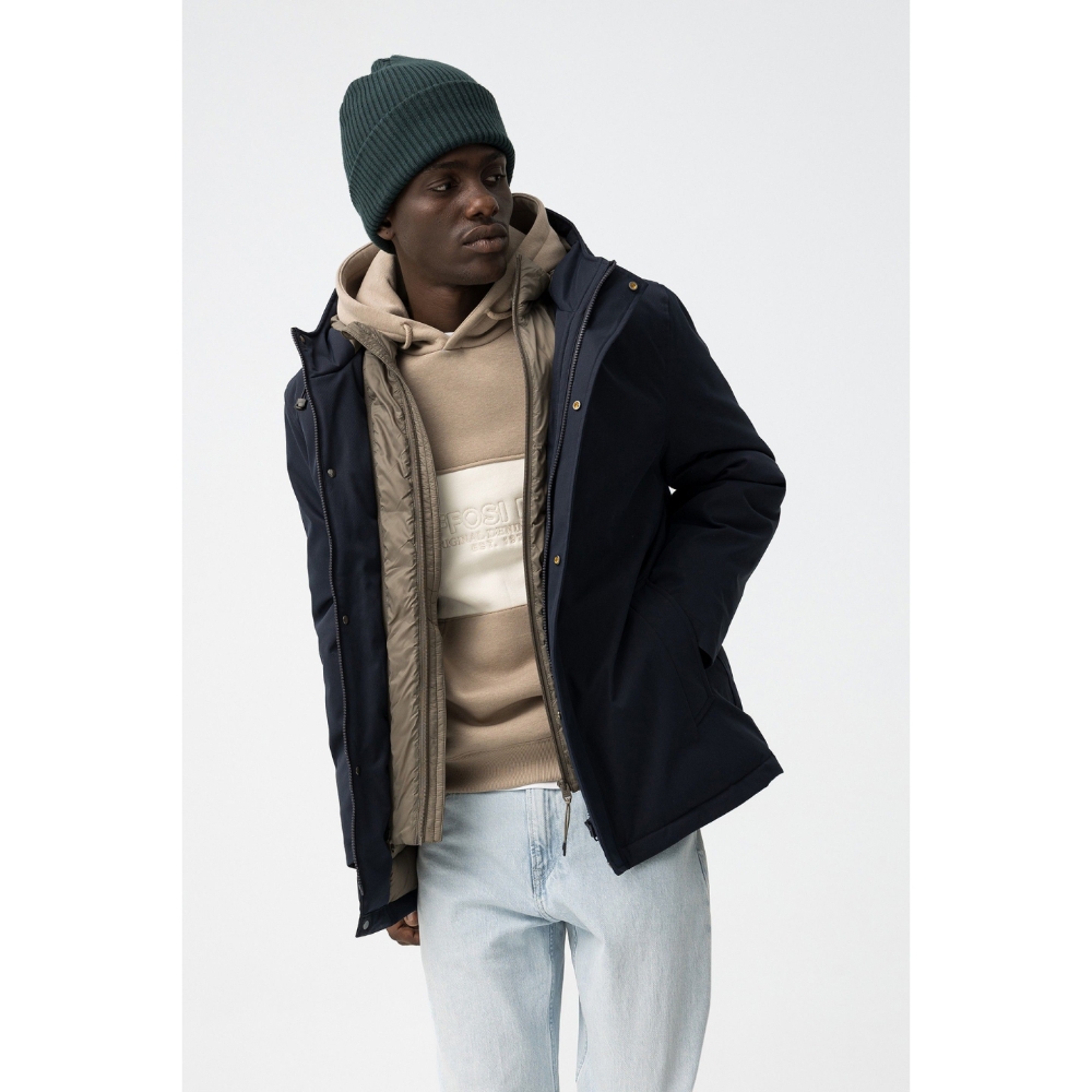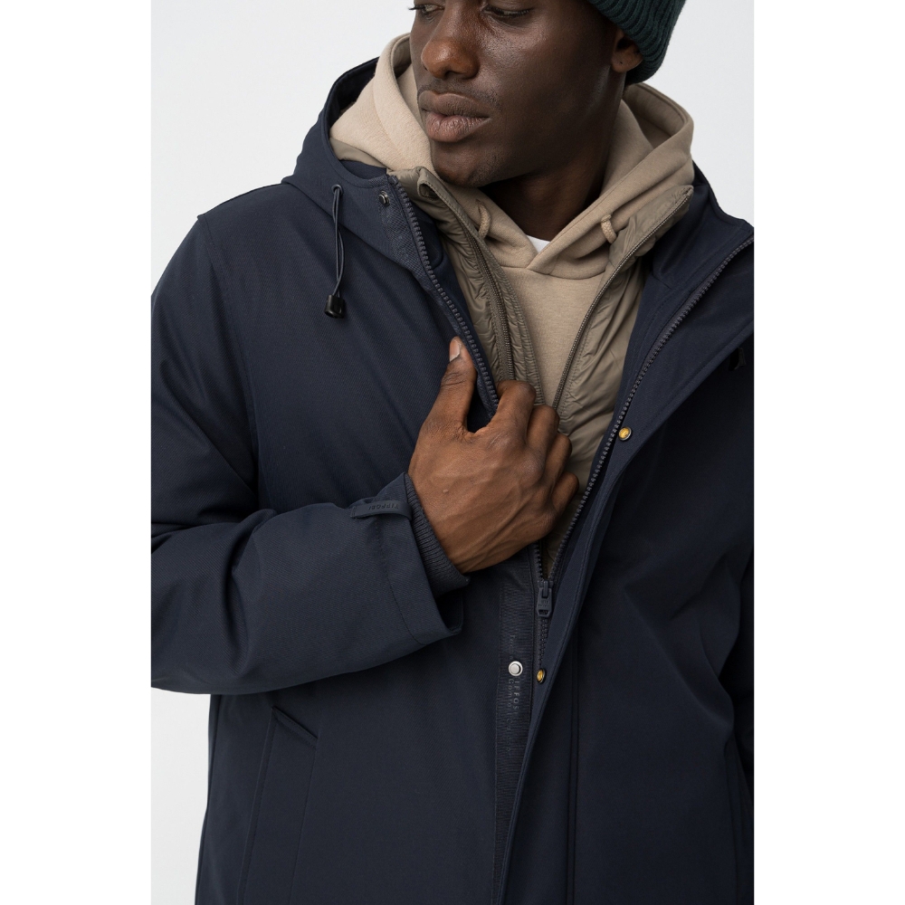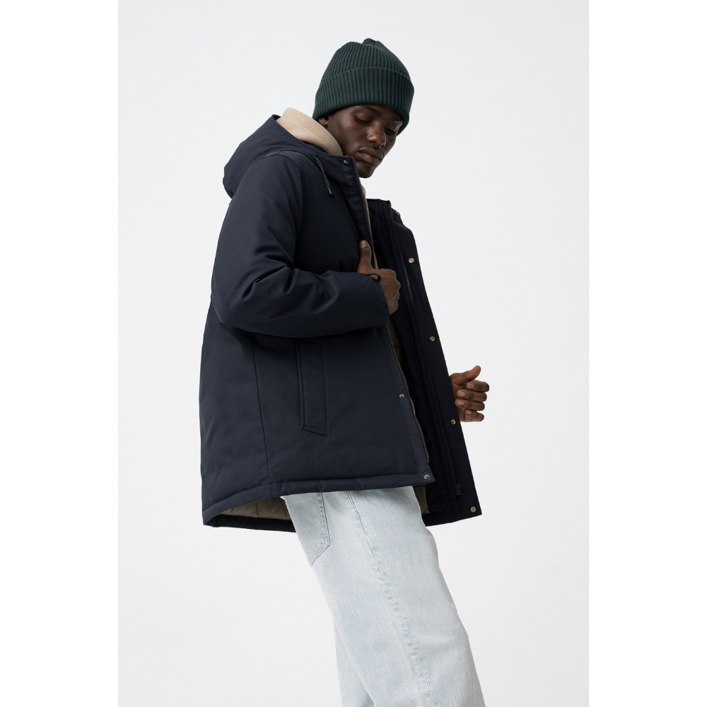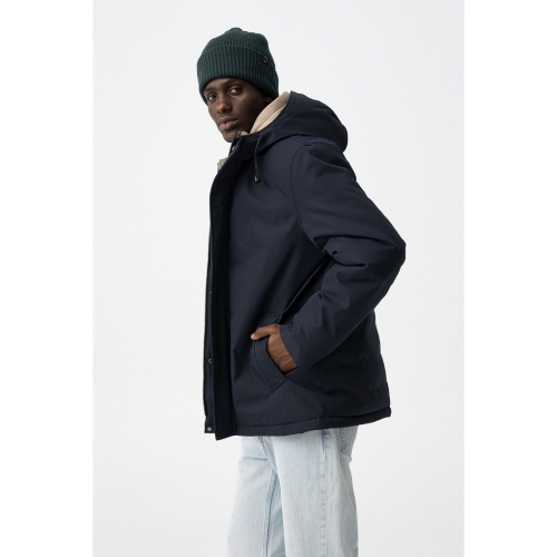 Abrigo largo en azul marino oscuro, corte regular, capucha ajustable y bolsillos laterales.100% POLYESTER