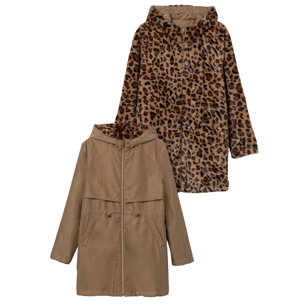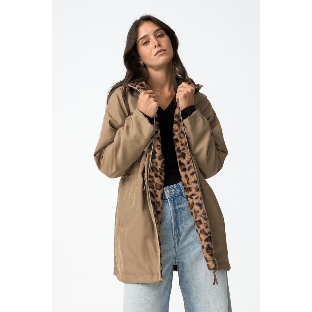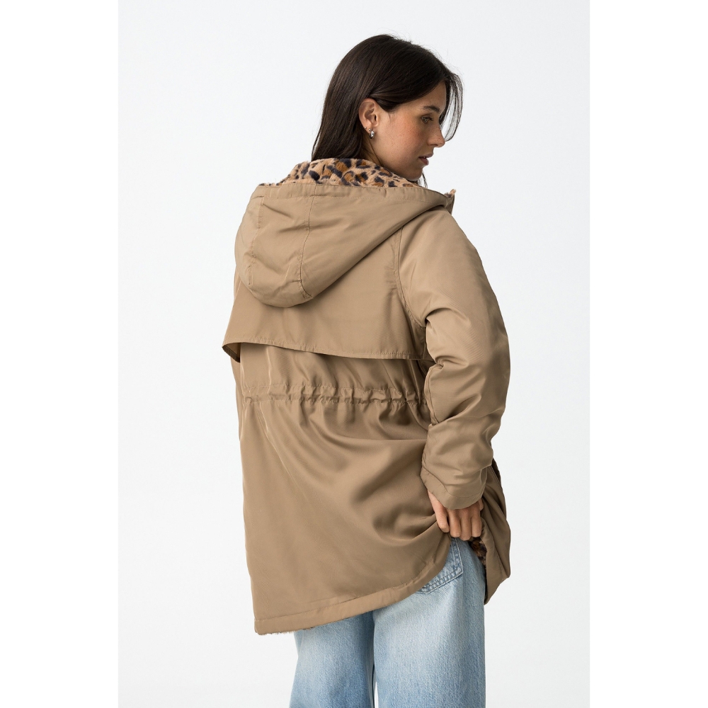 Parka relaxed fit de manga larga con capucha. Cremallera frontal. Bolsillos laterales y ajuste de cintura con cordón. Reversible: un lado en tejido liso y otro en pelo sintético.