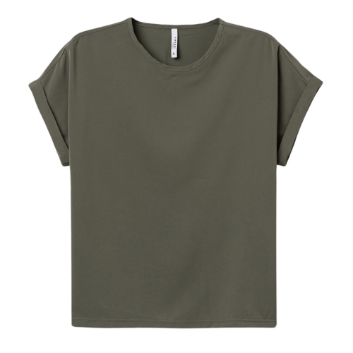 Blusa de color verde, corte relaxed, manga corta doblada y cuello redondo, rollo minimalista casual.100% POLYESTER
