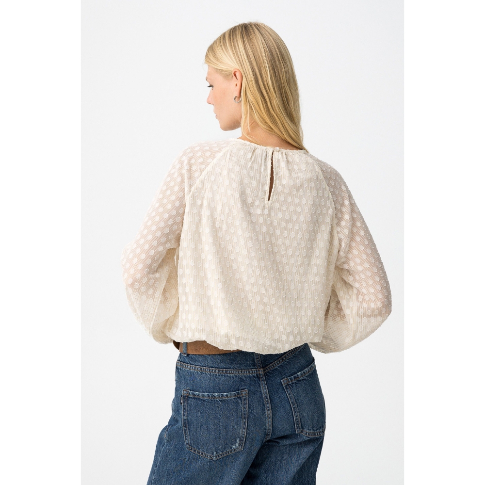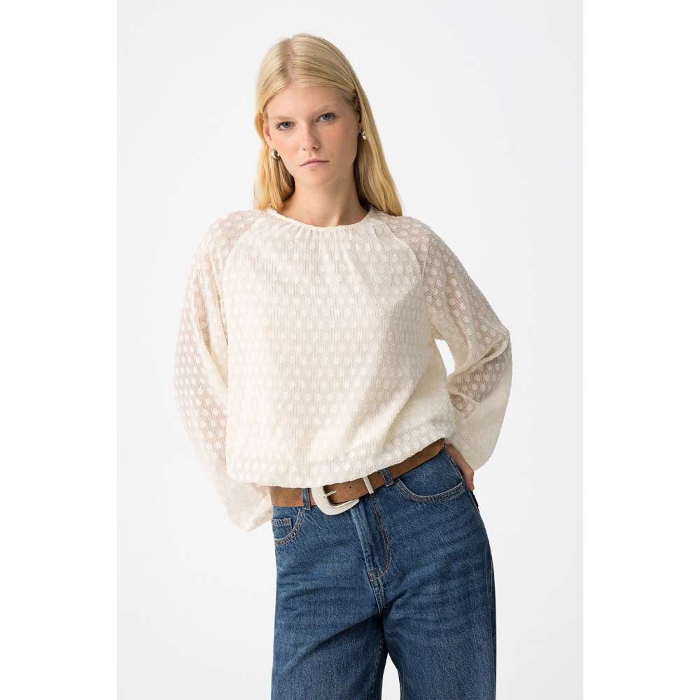 Blusa relaxed fit bordada con hilo metálico. Cuello redondo con cierre de botón trasero, manga larga y acabados con elástico interior.