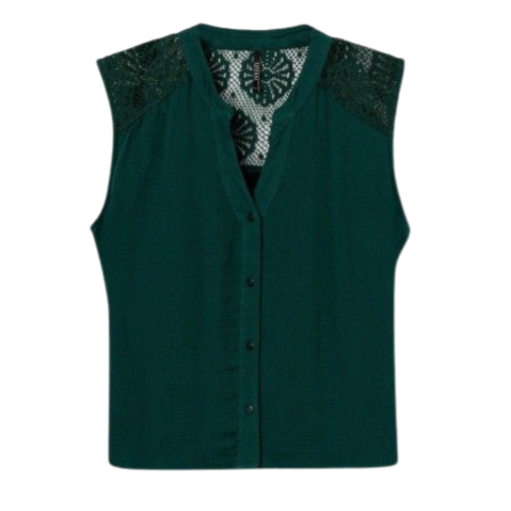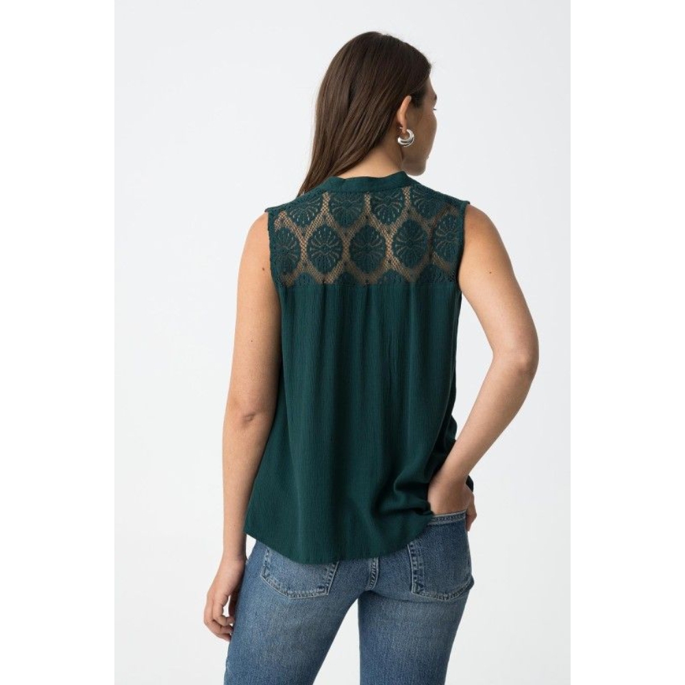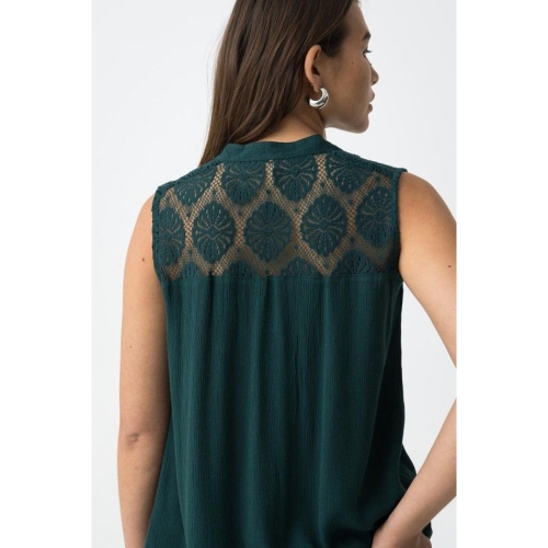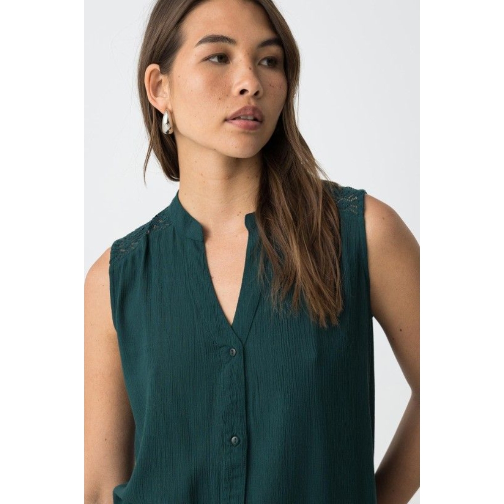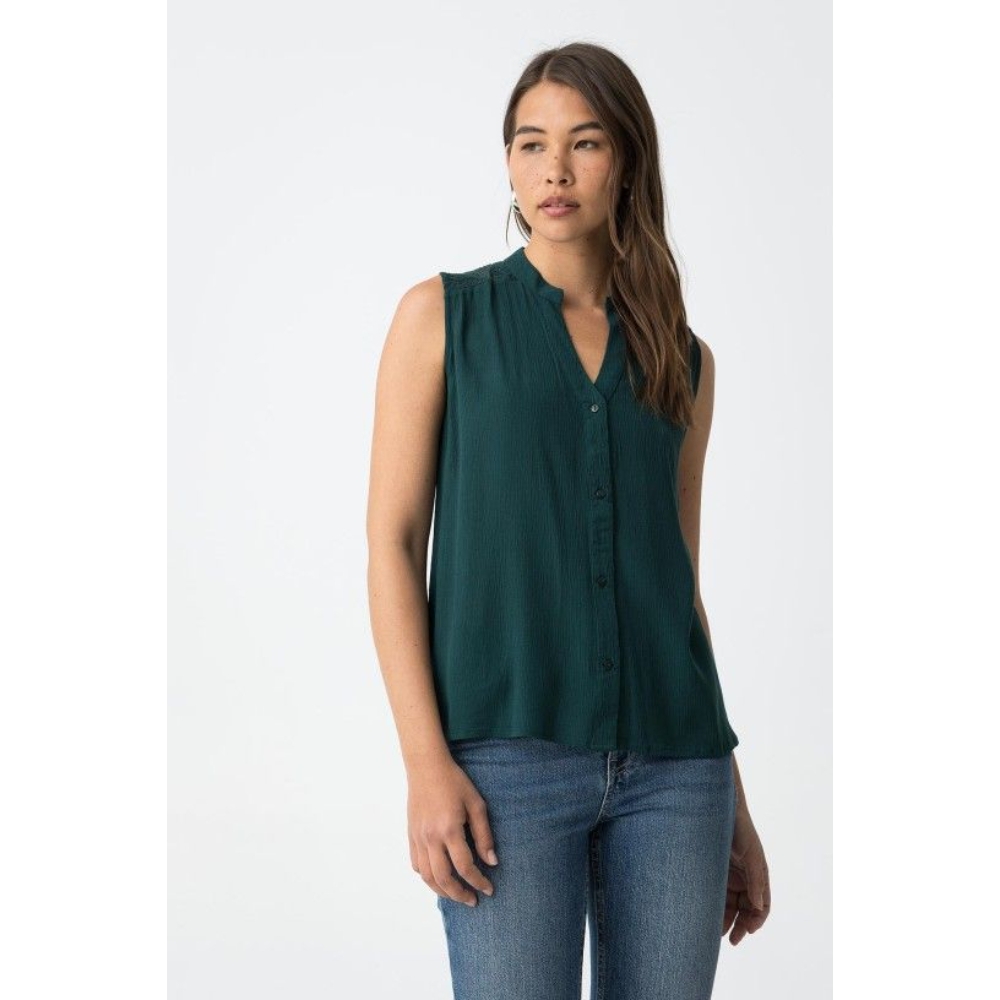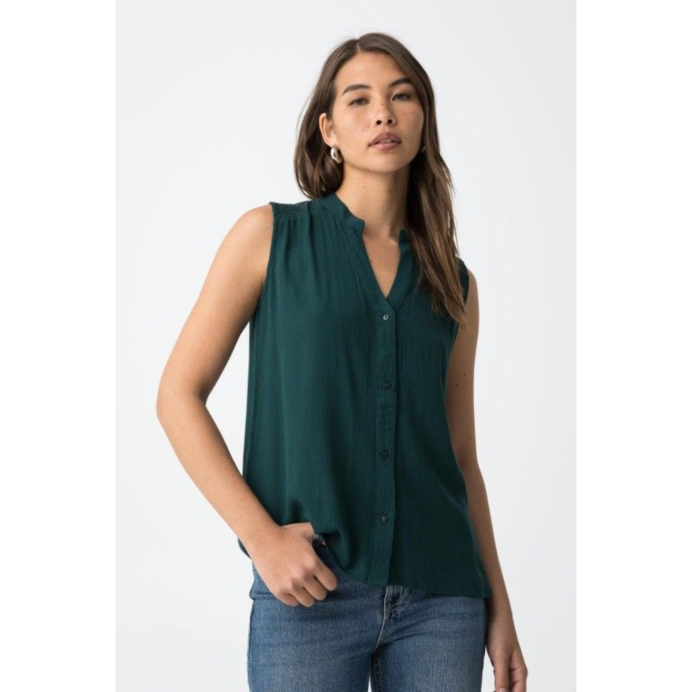 Blusa sin mangas de tejido arrugado con abertura en V al frente y pequeño cuello alto. Aplique y pliegue en la parte posterior.
