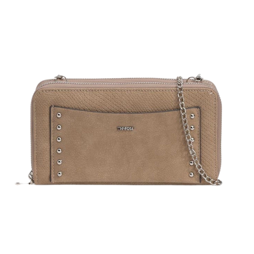 Monedero efecto ante con apliques metálicos, asa de cadena extraíble y cierres de cremallera. Interior con compartimentos para tarjetas, billetes y bolsillo con cremallera.100% POLYURETHANE