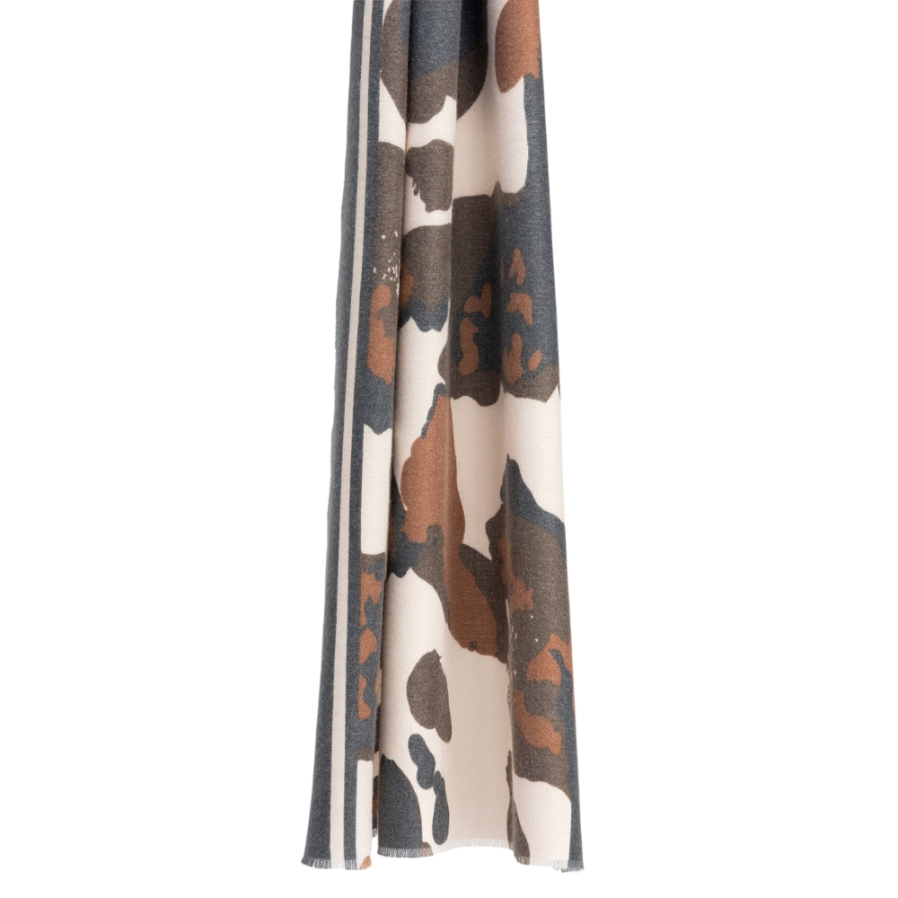 Bufanda plisada con estampado bicolor y acabado deshilachado.