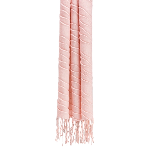 Cachecol rosa suave com textura plissada y franjas largas. Elegante y cómodo para cualquier ocasión.80% POLYESTER 20% VISCOSE