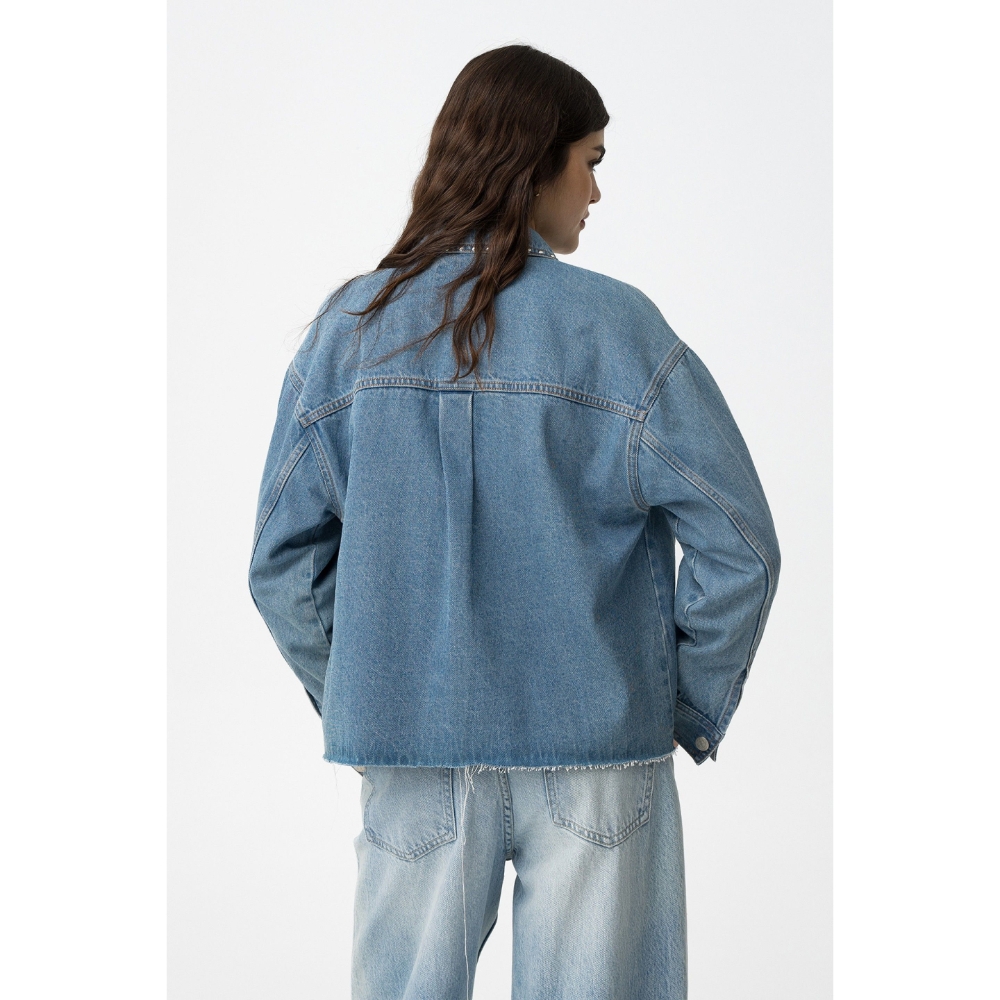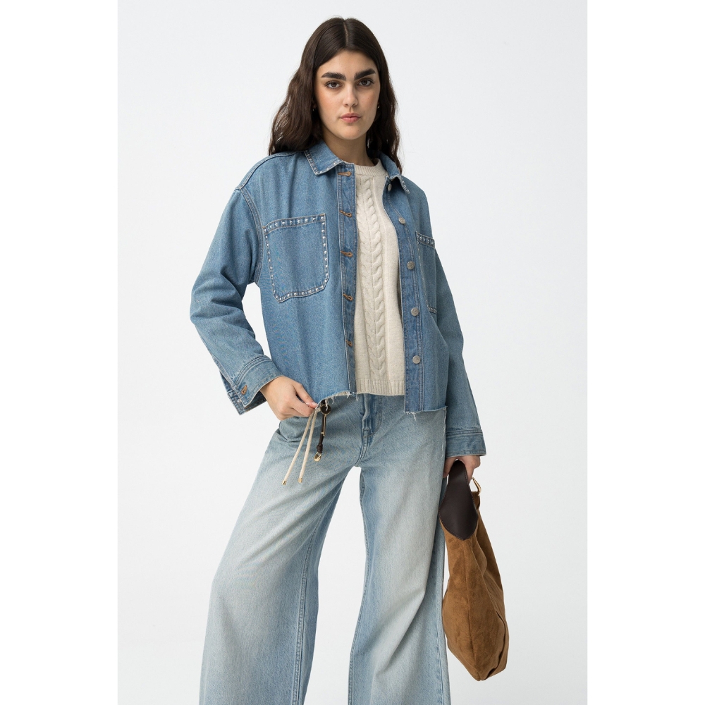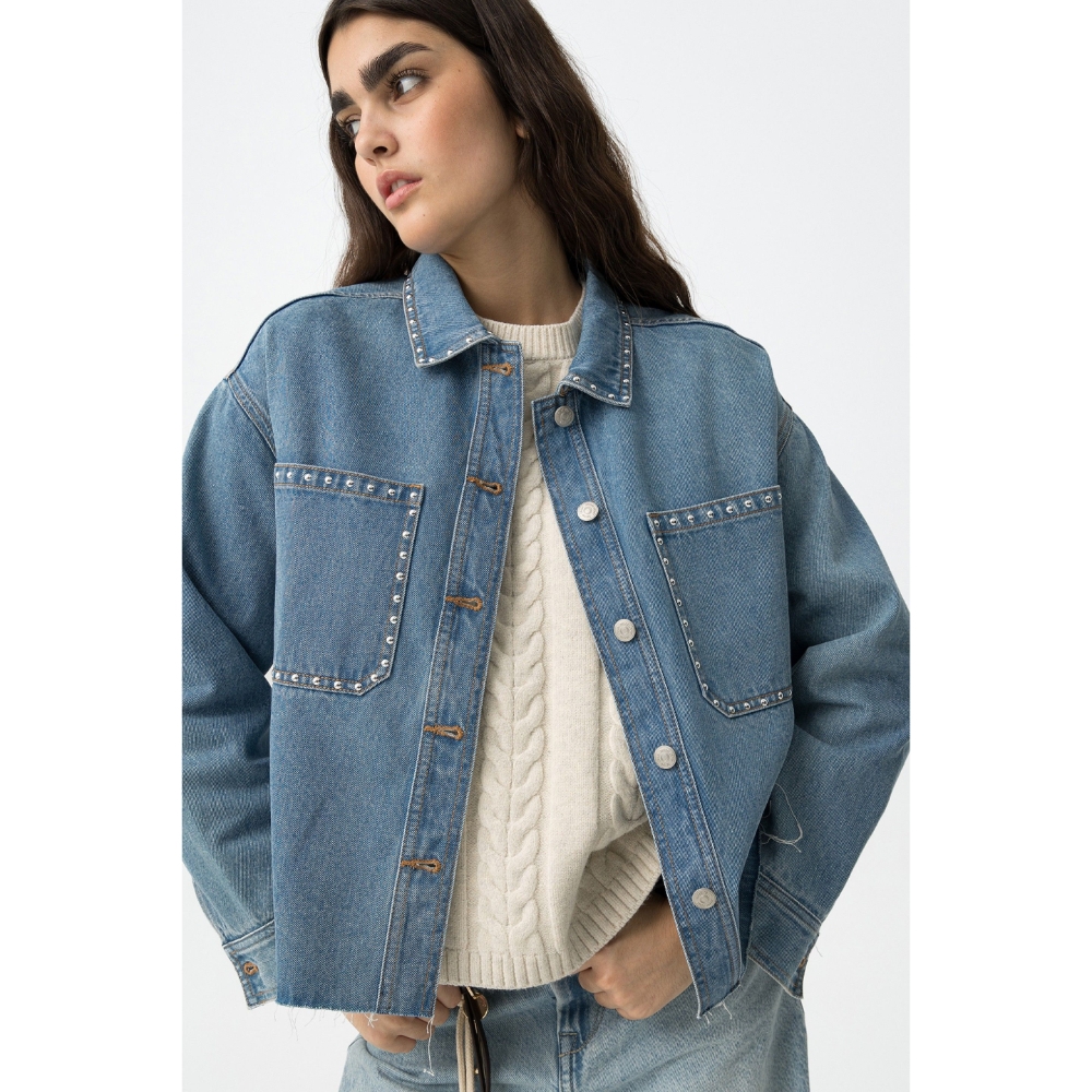 Camisa denim relaxed fit con dos bolsillos de parche frontales y aplicaciones metálicas. Cuello camisero, manga larga, cierre de botón metálico y bajo deshilachado.100% COTTON