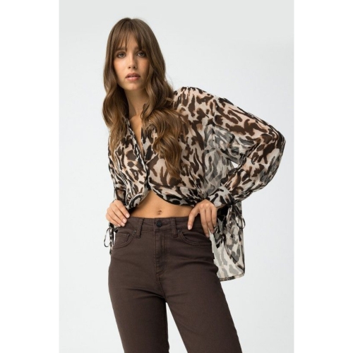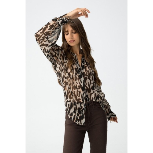 Camisa relaxed fit semitransparente con estampado de leopardo. Cuello camisero, manga larga con lazos en los puños y bajo curvo asimétrico.100% POLYESTER