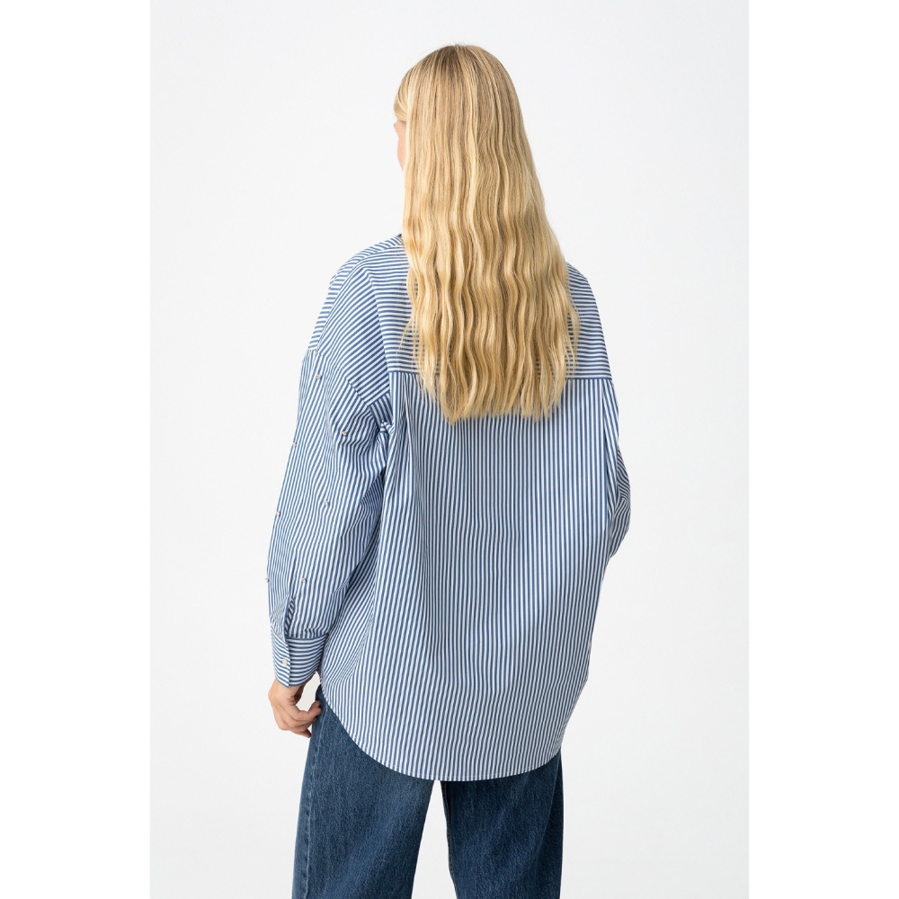 Camisa oversized a rayas con aplicaciones de joyas. Cuello camisero, cierre frontal con botones, manga larga con botones en los puños y bajo curvo asimétrico.70% COTTON 30% POLYESTER