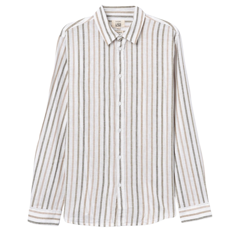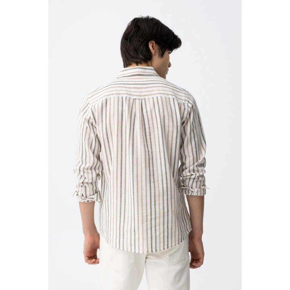 Camisa recta de rayas en tonos verde y beige, con botones blancos y puños ajustados.55% LINEN 45% COTTON