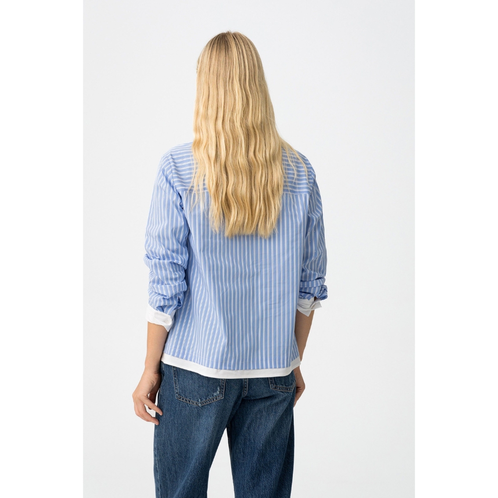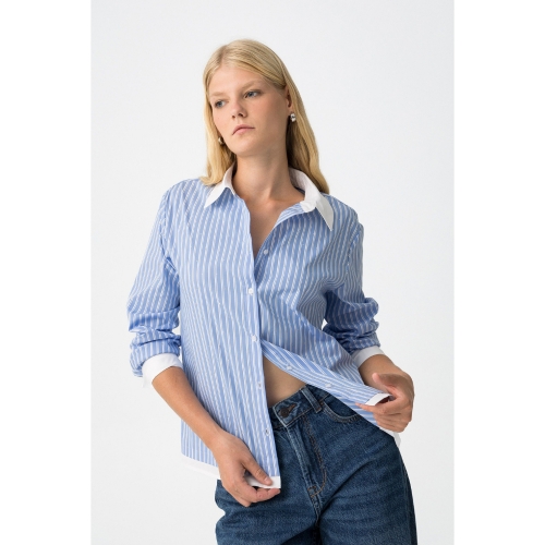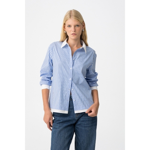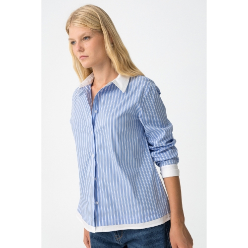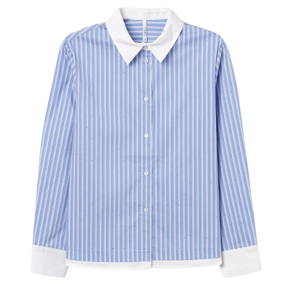 Camisa regular fit de rayas, con apliques brillantes y contraste de color. Cuello clásico, cierre de botones y manga larga con puños abotonados.70% COTTON 27% POLYAMIDE 3% ELASTANE