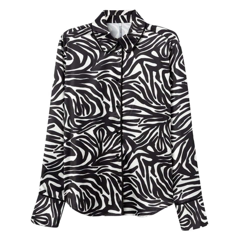 Camisa regular fit satinada, con estampado all over y acabado de bies. Cuello, cierre de botón, manga larga y bajo corto.100% POLYESTER