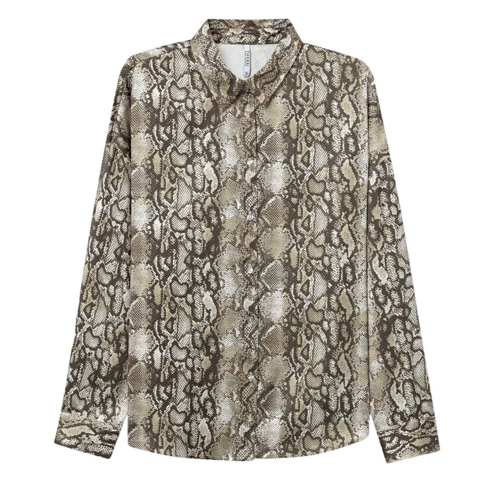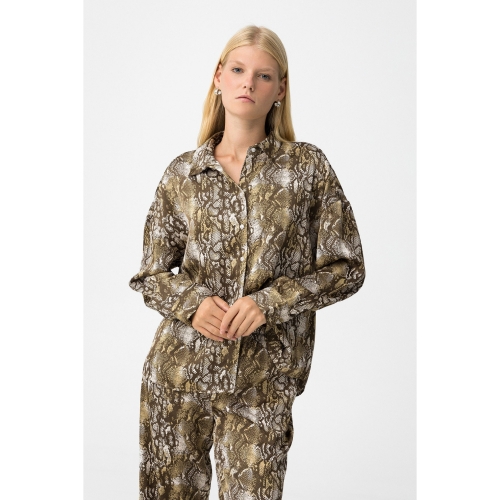 Camisa satinada relaxed fit con estampado animal all over, cuello clásico, cierre de botones y manga larga con puños abotonados.100% POLYESTER