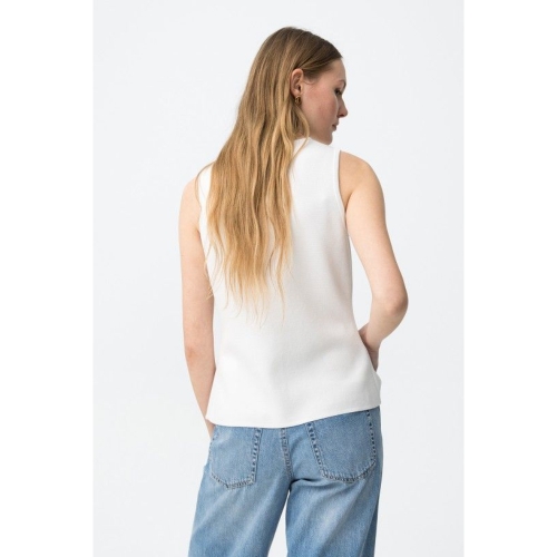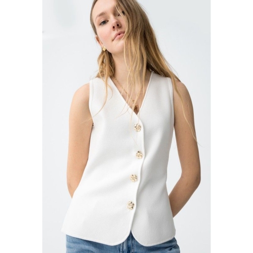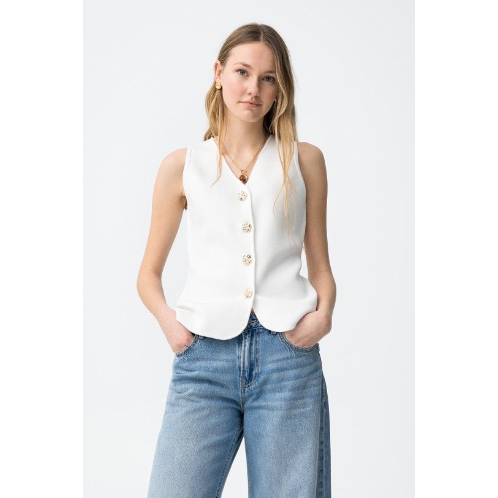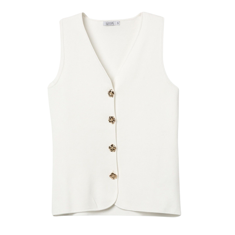 Camiseta de color crudo, corte ajustado, sin mangas, botones dorados decorativos, estilo minimalista actual.