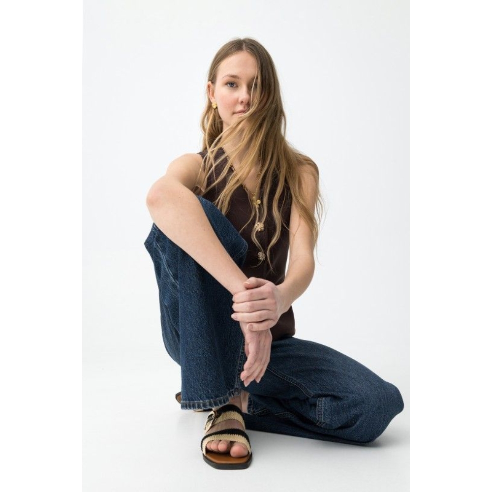 Camiseta de color crudo, corte ajustado, sin mangas, botones dorados decorativos, estilo minimalista actual.