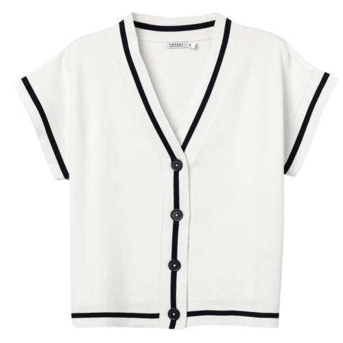 Camiseta de color crudo, corte relaxed, manga corta, botones frontales y detalles en azul marino.70% VISCOSE 30% POLYESTER