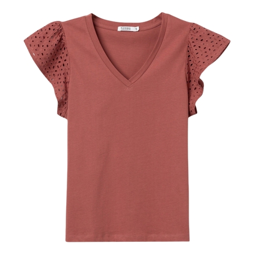 Camiseta rosa de corte regular, escote en V y mangas cortas con detalle calado tipo encaje.100% COTTON