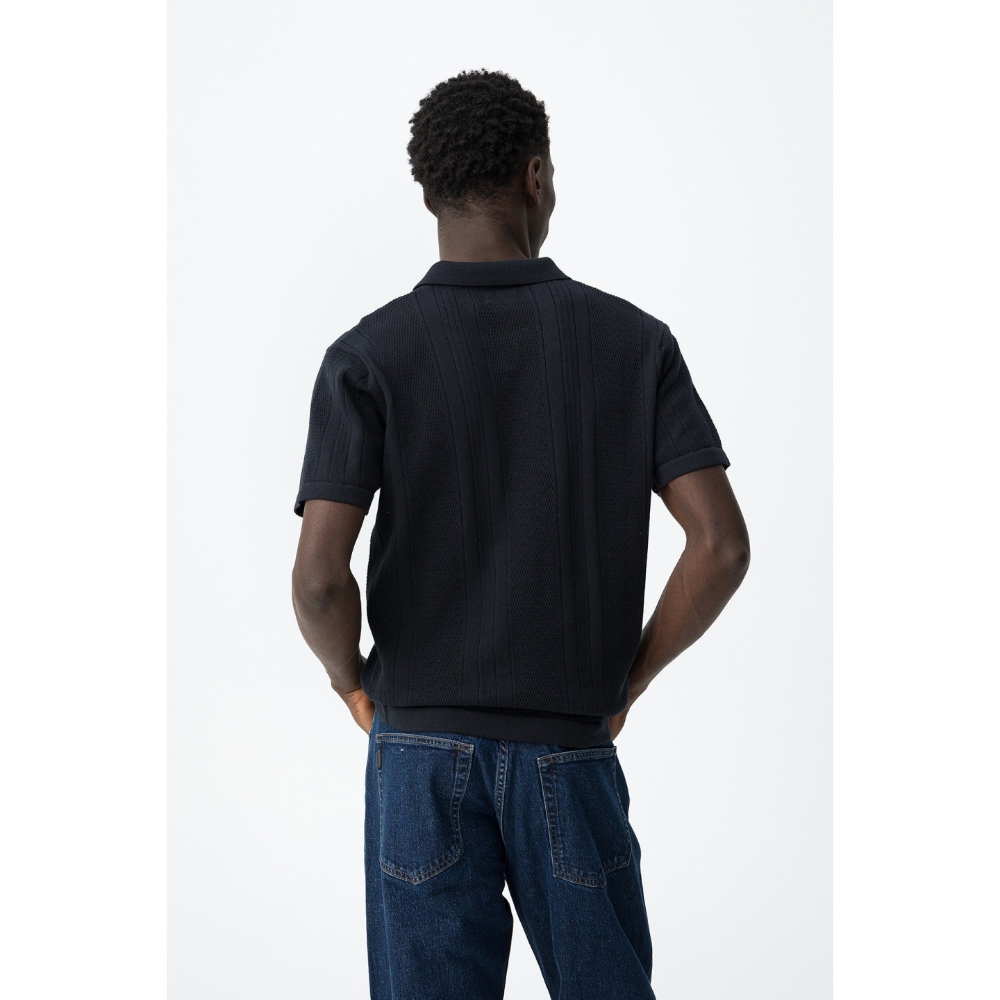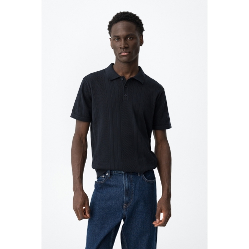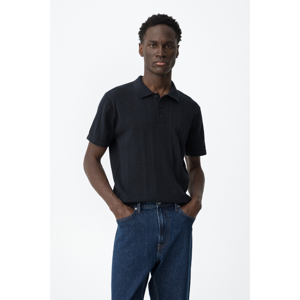 Camiseta de manga corta en azul oscuro, corte recto, cuello polo y botones visibles.100% COTTON
