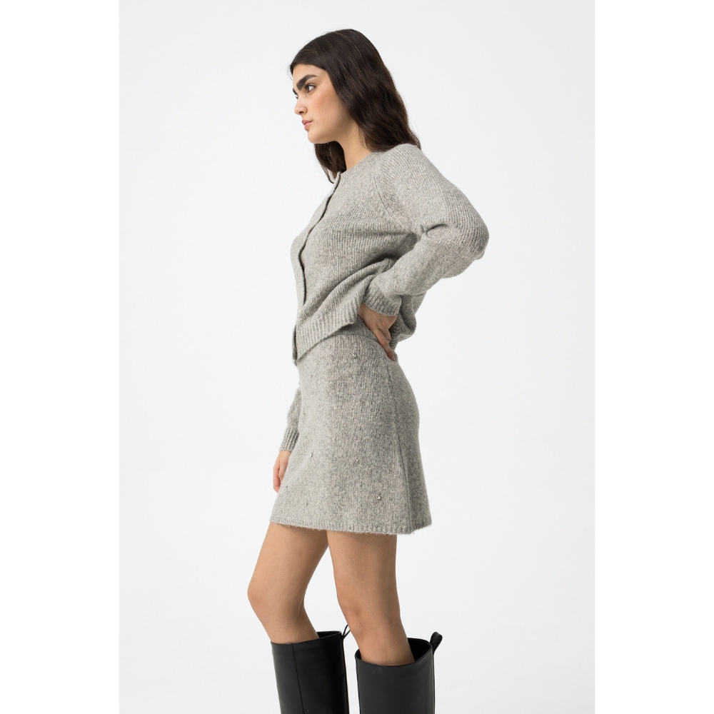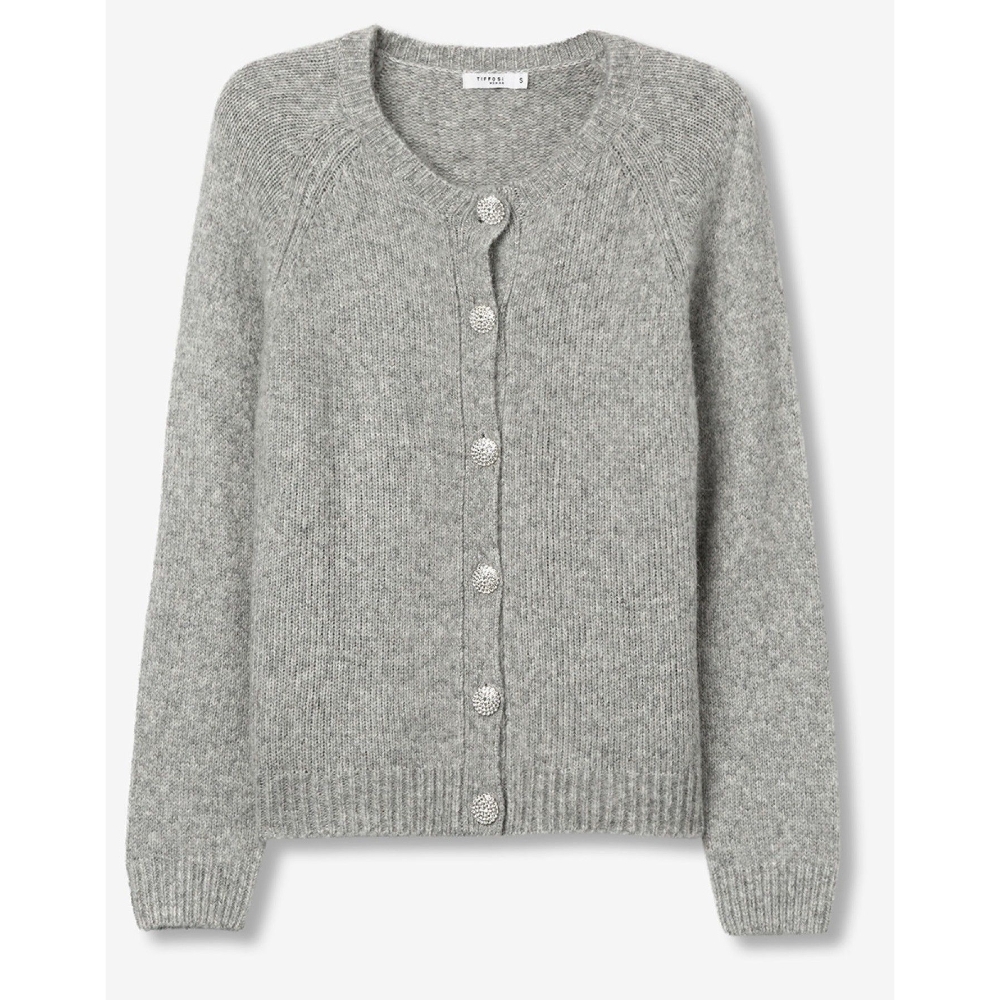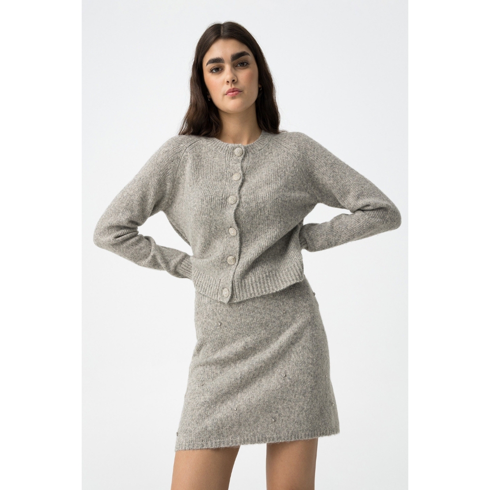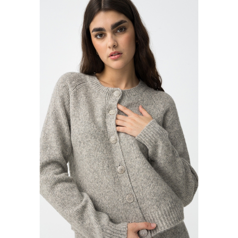 Cárdigan de manga larga con cuello redondo. Cierre frontal de seis botones con piedras decorativas. Punto texturizado de patrón fino. Puños y bajo en rib.63% ACRYLIC 30% POLYAMIDE 7% ALPACA