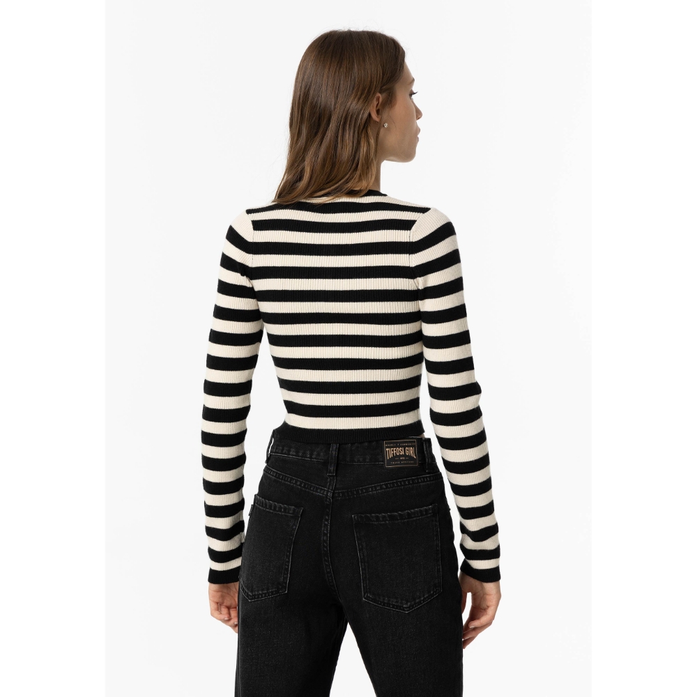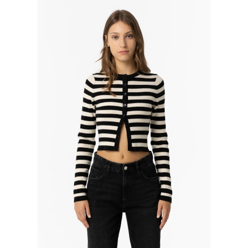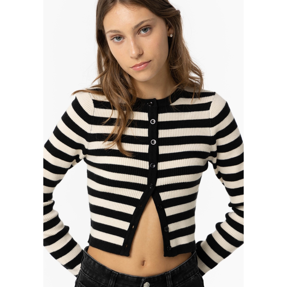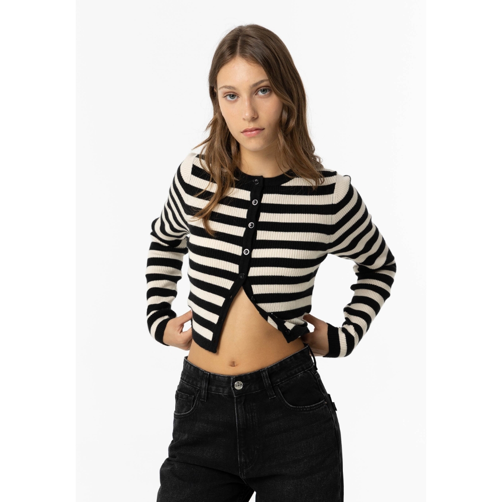 Cárdigan de punto de cuello redondo y manga larga. Cierre frontal con botones.