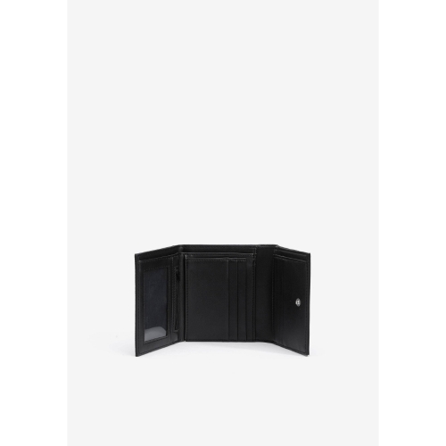 Monedero mediano liso con apertura con solapa con botón y bolsillo interior con cremallera. Compartimentos para tarjetas en el interior.