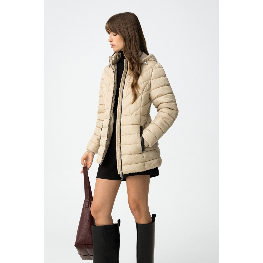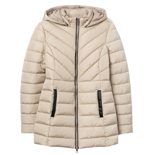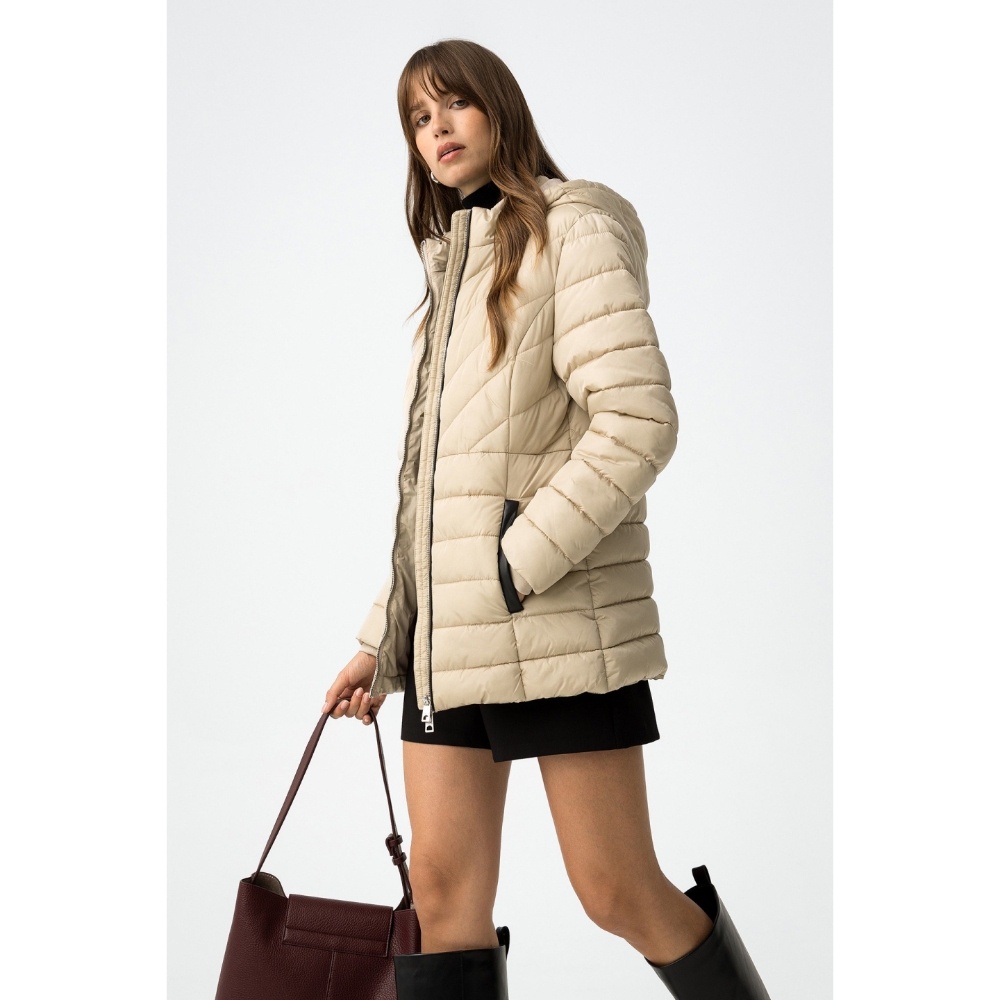 Cazadora acolchada regular fit, con dos bolsillos frontales, contrastes efecto piel y cierre de cremallera. Capucha ajustable y desmontable. Cuello alto y manga larga con puños de canalé.