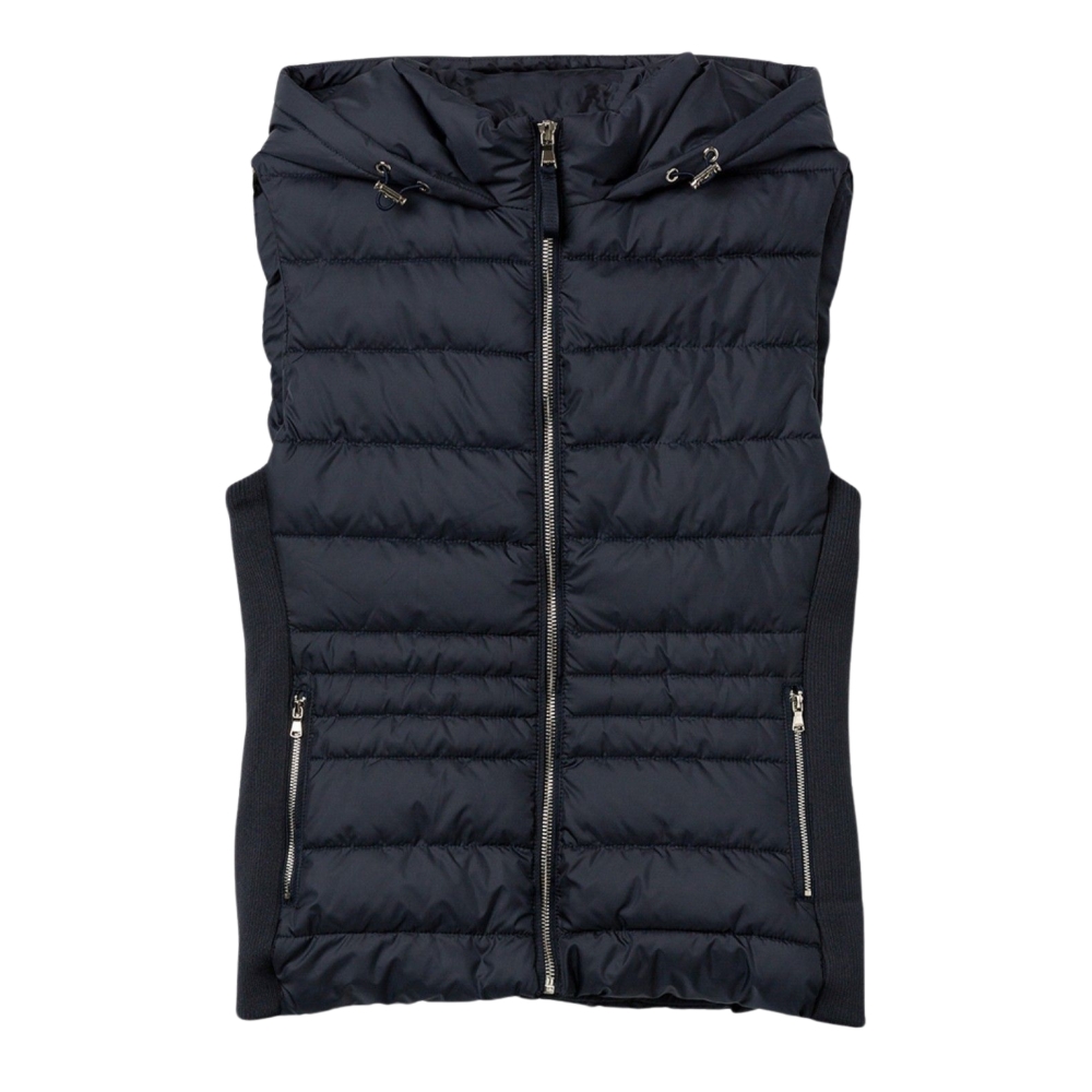Chaleco acolchado con capucha ajustable y cremallera frontal. Bolsillos con cierre. Parte delantera y trasera en tejido liso laterales en punto acanalado.