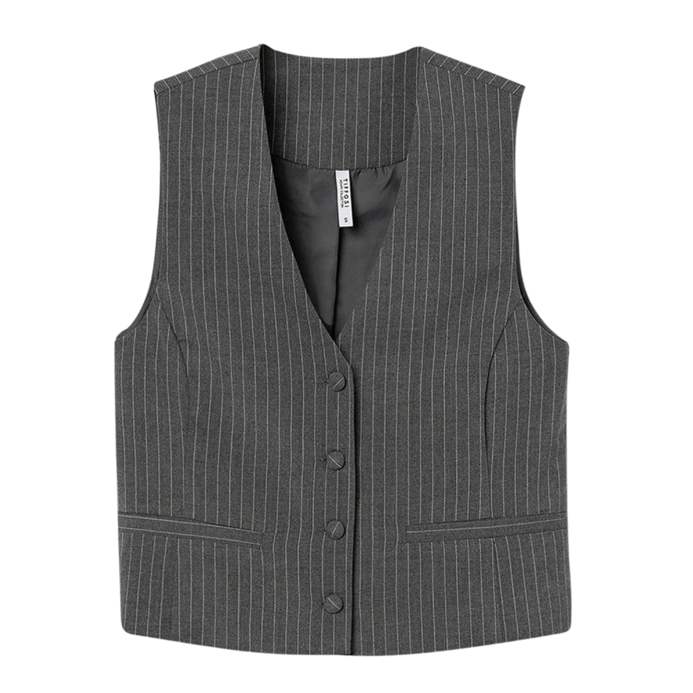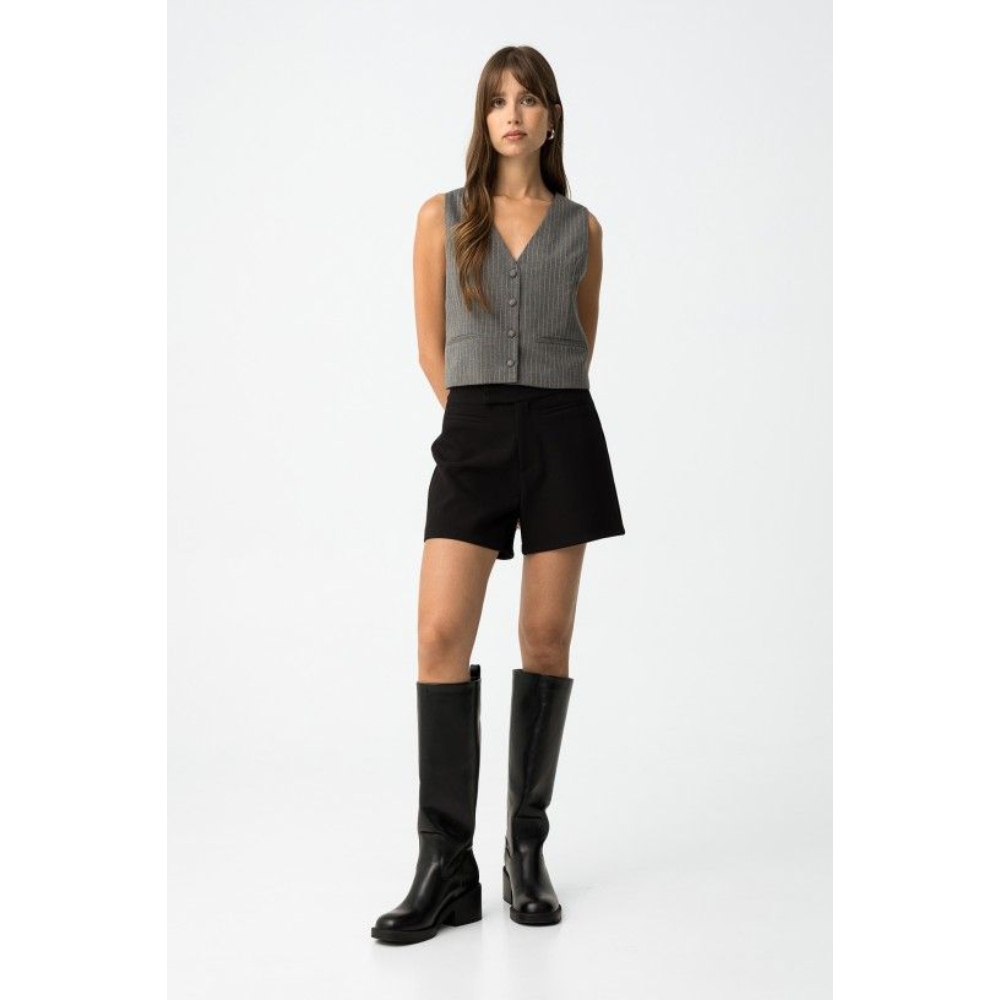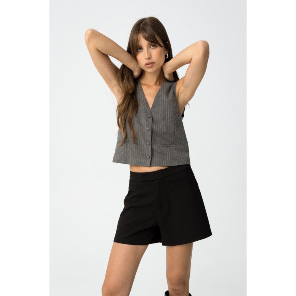 Top chaleco slim fit con estampado a rayas, dos vivos decorativos y cierre de botón. Escote en V y sisa.64% POLYESTER 34% VISCOSE 2% ELASTANE