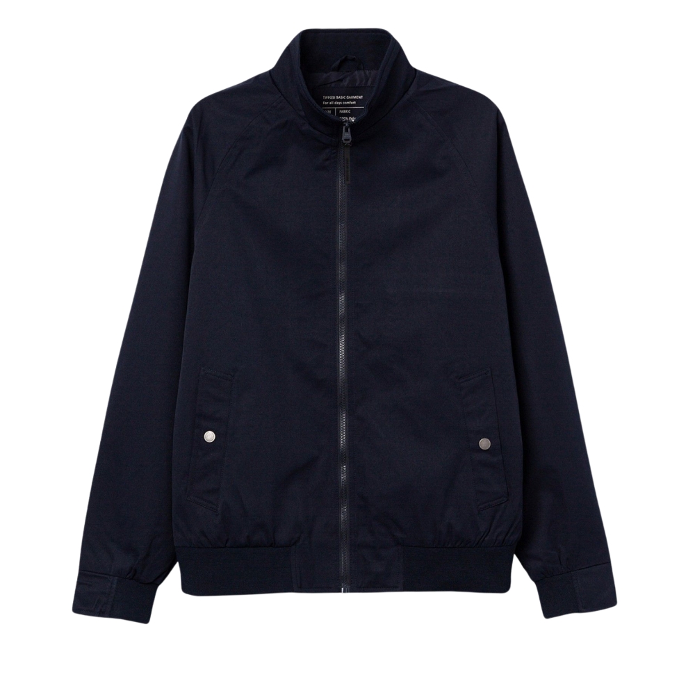 Chaqueta azul oscuro de corte regular con cremallera frontal y cuello alto, ideal para un look casual. 100% POLIÉSTER