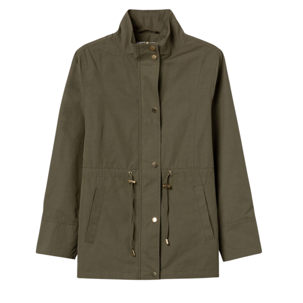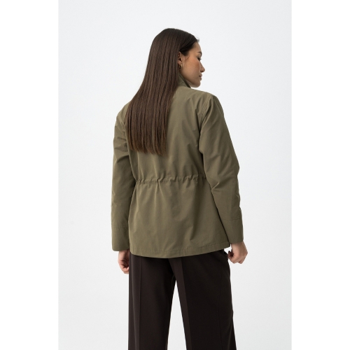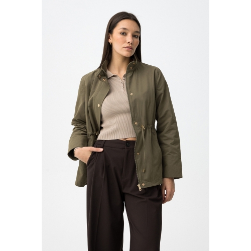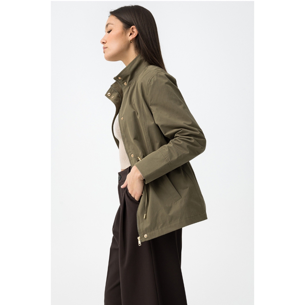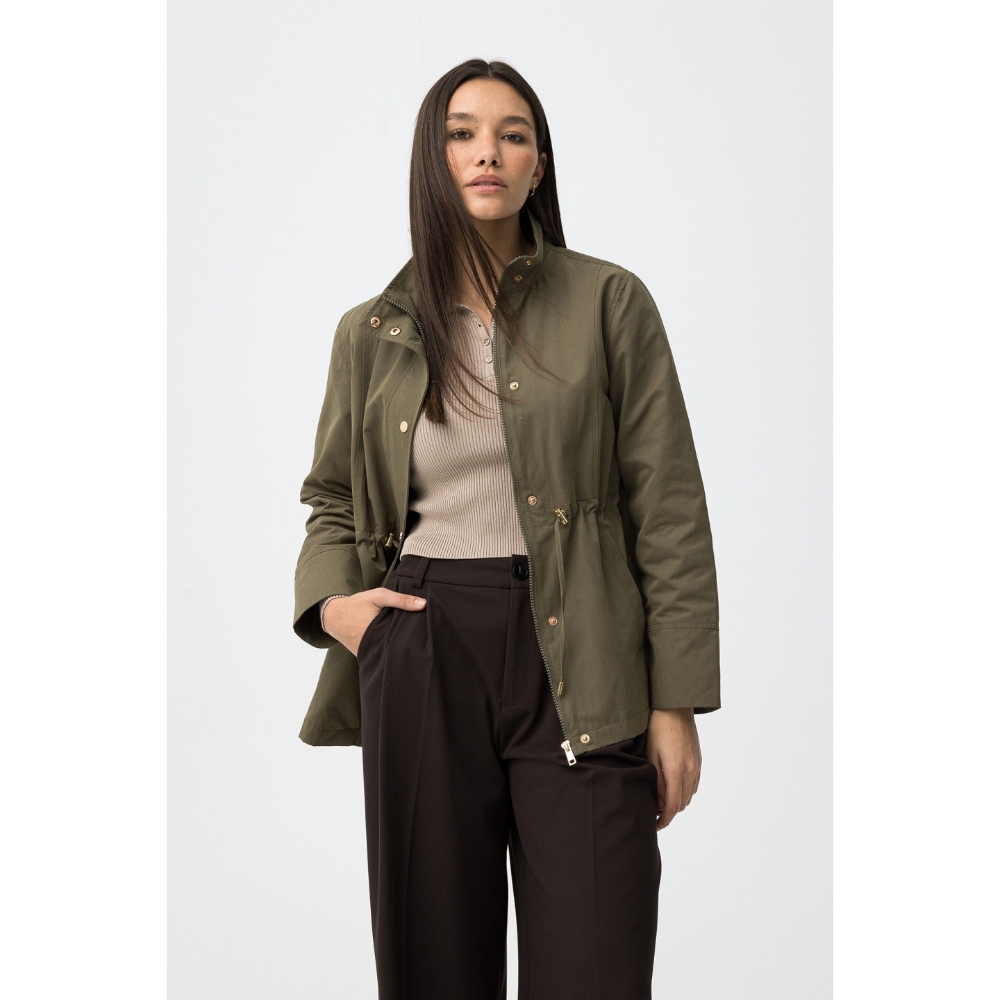 Chaqueta verde de corte regular con cierre de botones y cintura ajustable con cordón. 60% POLIÉSTER 40% ALGODÓN